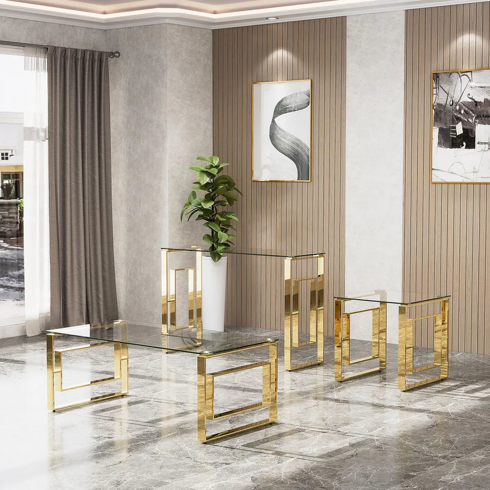 With its neutral color palette, featuring gold and clear glass, our coffee table set seamlessly complements a wide range of interior decor styles. It effortlessly harmonizes with contemporary, traditional, or eclectic settings.