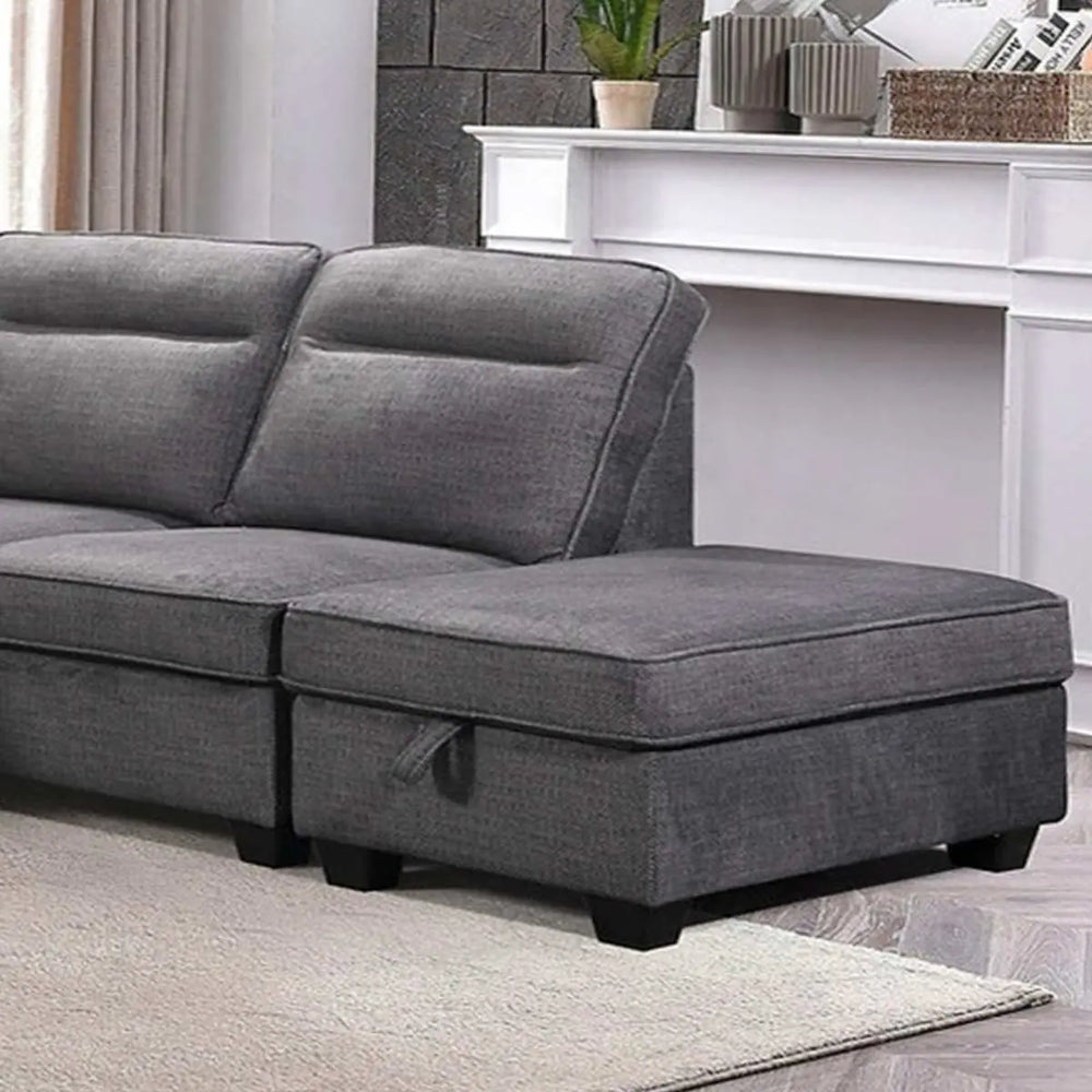 The Sofa Bed Sectional in Grey 9010 is a versatile piece designed for both comfort and functionality. This sectional features a right-hand facing chaise and a large lift-up storage compartment, perfect for keeping essentials close at hand. It easily opens into a bed, providing a convenient sleeping solution for guests. The floating storage ottoman adds extra versatility and storage options. The backrest showcases horizontal tufting with piping details, adding a touch of elegance to its design. Upholstered in soft grey fabric, this sofa bed sectional seamlessly blends style and practicality