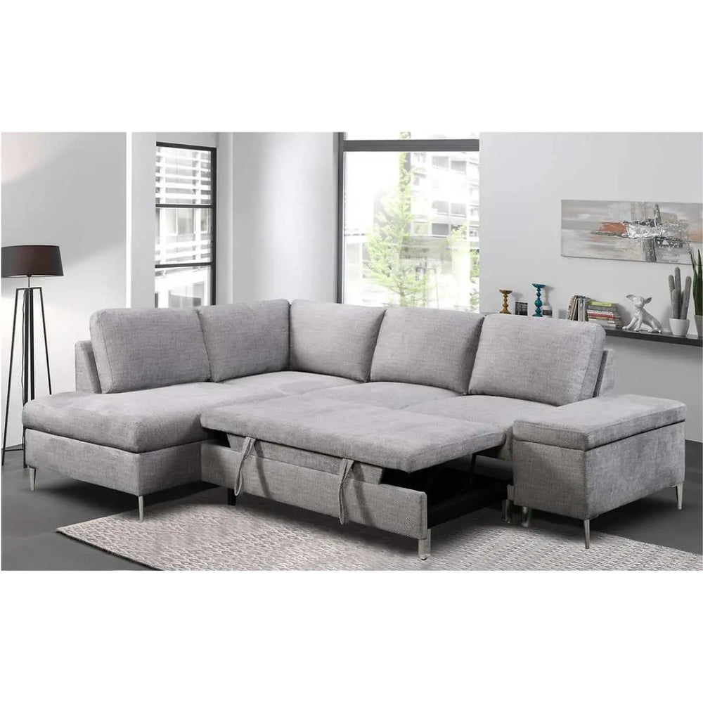 The Sofa Bed Sectional with Storage Bench 9022 is a practical and stylish addition to any living space. Featuring a left-hand facing chaise and a large lift-up storage bench compartment, this sectional offers ample storage for your essentials. It easily converts into a bed, providing a convenient sleeping solution for guests. Upholstered in soft grey fabric, it combines comfort with contemporary design, making it a versatile choice for modern homes.