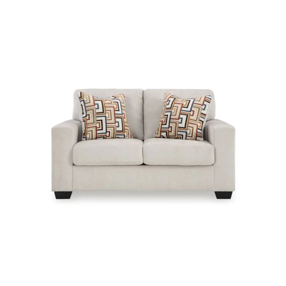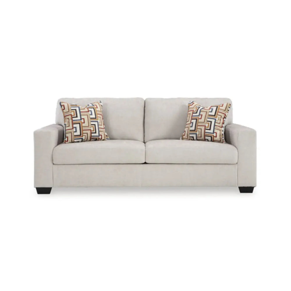 Looking to make a simply chic statement with color? Liven up your living room with this sofa set. Its trend-right light neutral upholstery is a perfect blank canvas for adding pops of color. Bold and eclectic accent pillows complete the look. Pairing posh style with everyday comfort, this piece is a welcome addition to contemporary spaces.