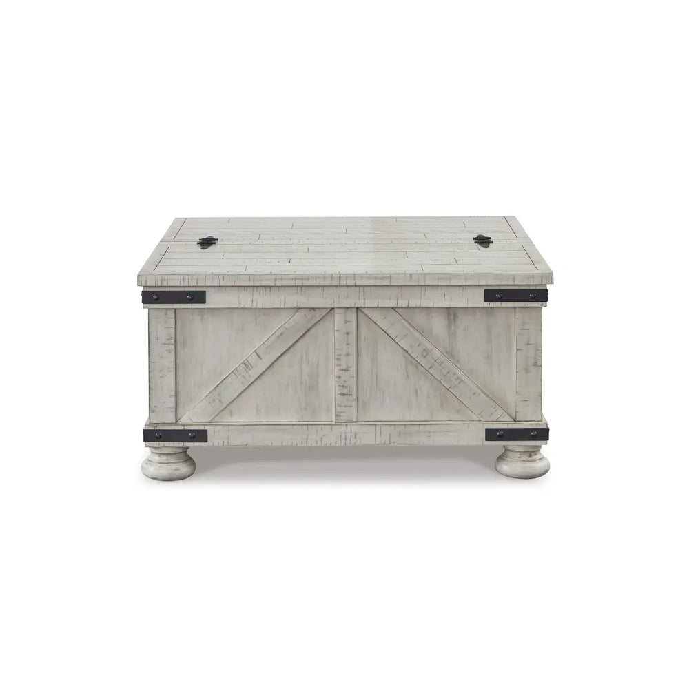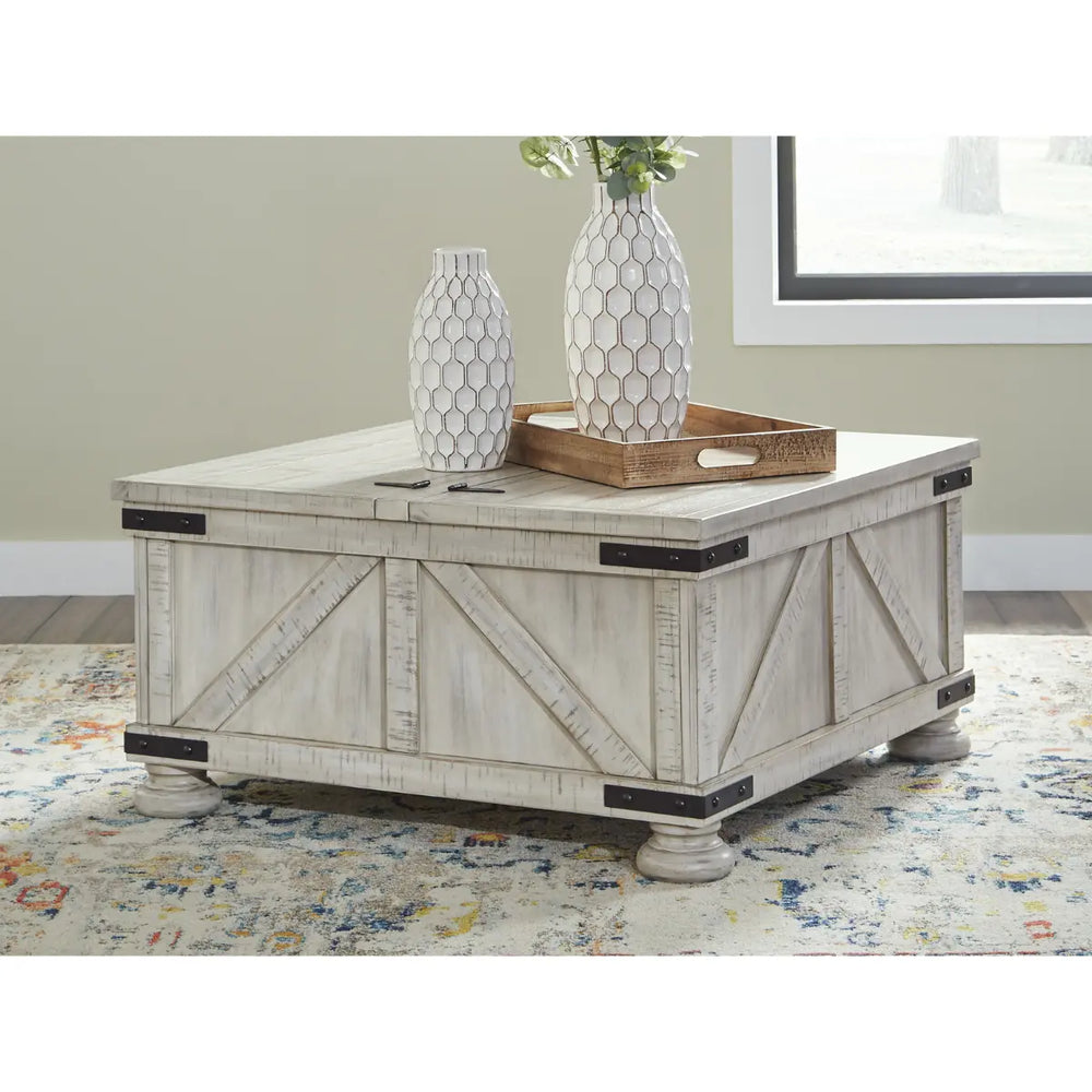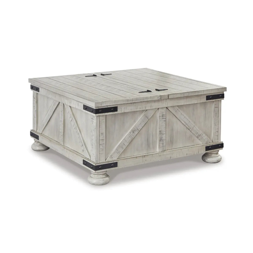 Double up on form and function with this square coffee table with storage. Its dual-lid tabletop provides easy access to the roomy storage space. Crafted with a distressed whitewash finish, crossbuck detailing and metal bracket appliques, this generously scaled coffee table is rustic farmhouse living at its best.
