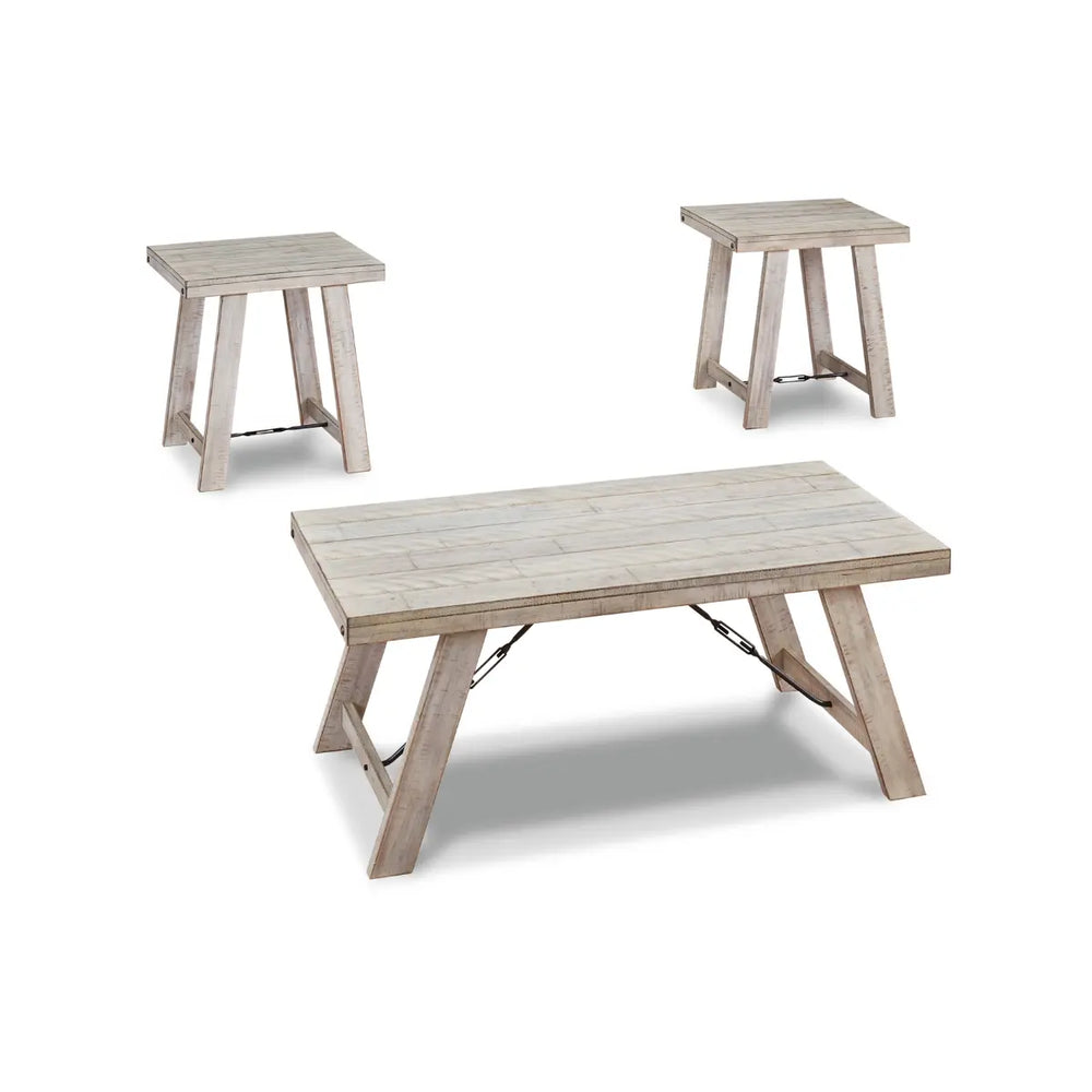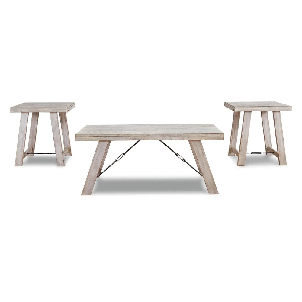 A rustic rendition of modern farmhouse style, this coffee table set is right in tune with your richly relaxed sense of style. The clean yet hearty profile is enhanced with a distressed whitewash finish and offset plank-effect tabletop. Decorative tension bar and nailhead accents add an industrial twist.