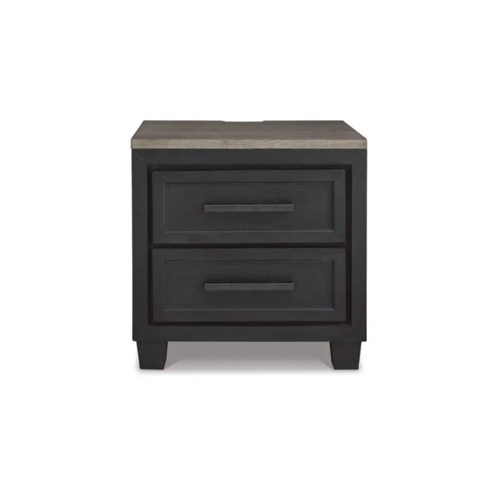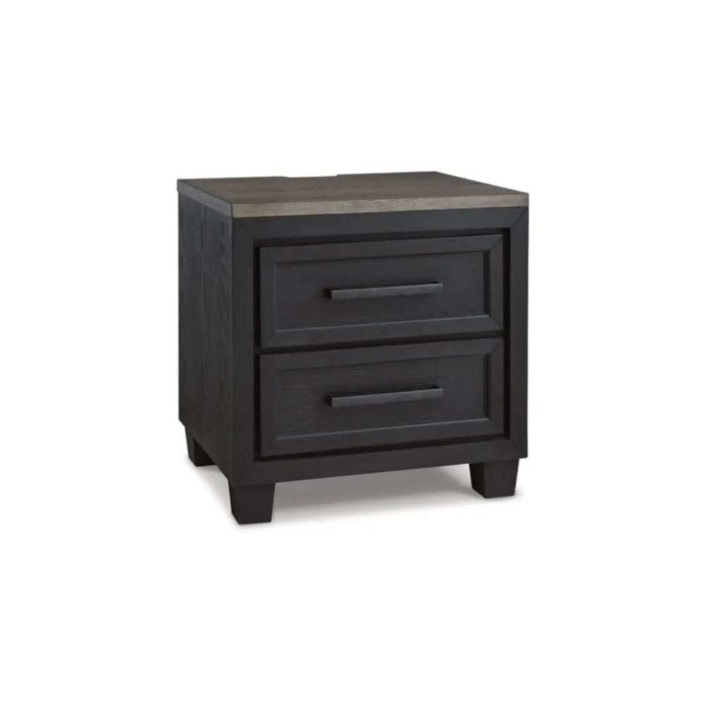 This nightstand is casual contemporary style simply done right. Its two-tone color scheme features a rich brushed black main color accented with a beautiful dusty grayish brown wood tone. Two drawers with sleek black pulls offer plenty of storage for your bedside essentials. The nightstand marries tech and clean-lined design, with a dual USB charging port along the upper back edge to keep your devices powered all evening long.