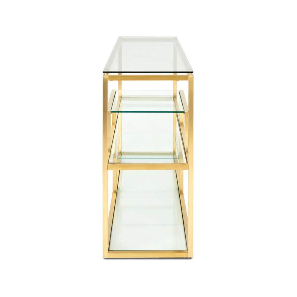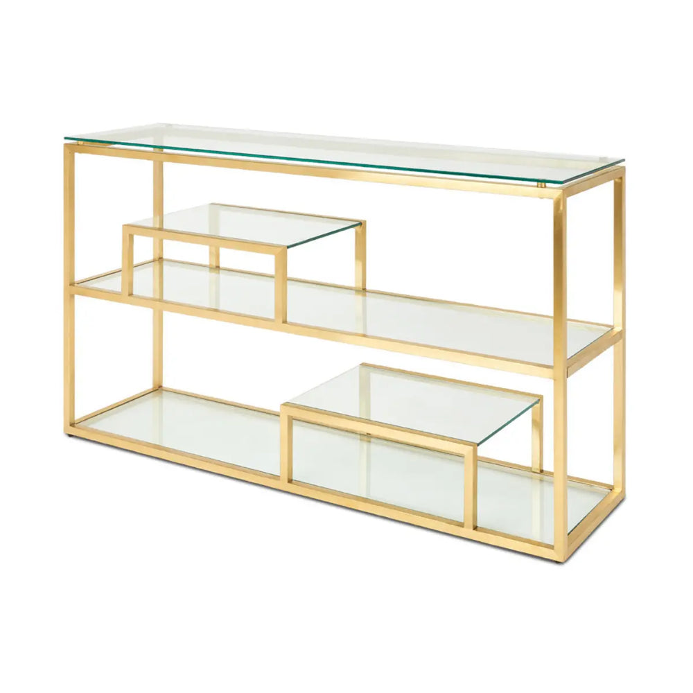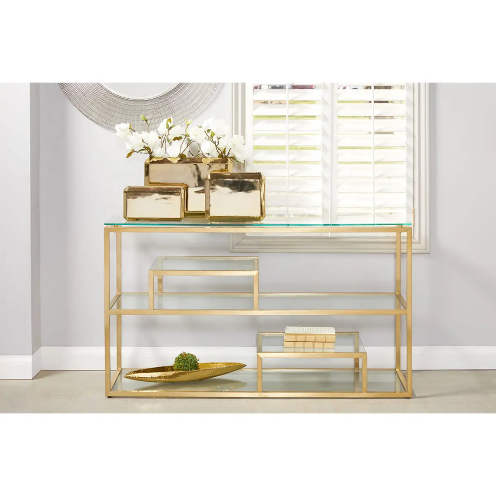 Simply chic. The Barolo console table offers three levels of tempered glass to achieve maximum storage and display. The multi-level design adds layers and complexity to your living room space. Combined with a brilliant brushed gold stainless steel base, this coffee table offers more than just functionality. The notably open and contemporary design adds a touch of glamour to your interior design. Shop the entire Barolo collection for an easy solution to your home decor space.