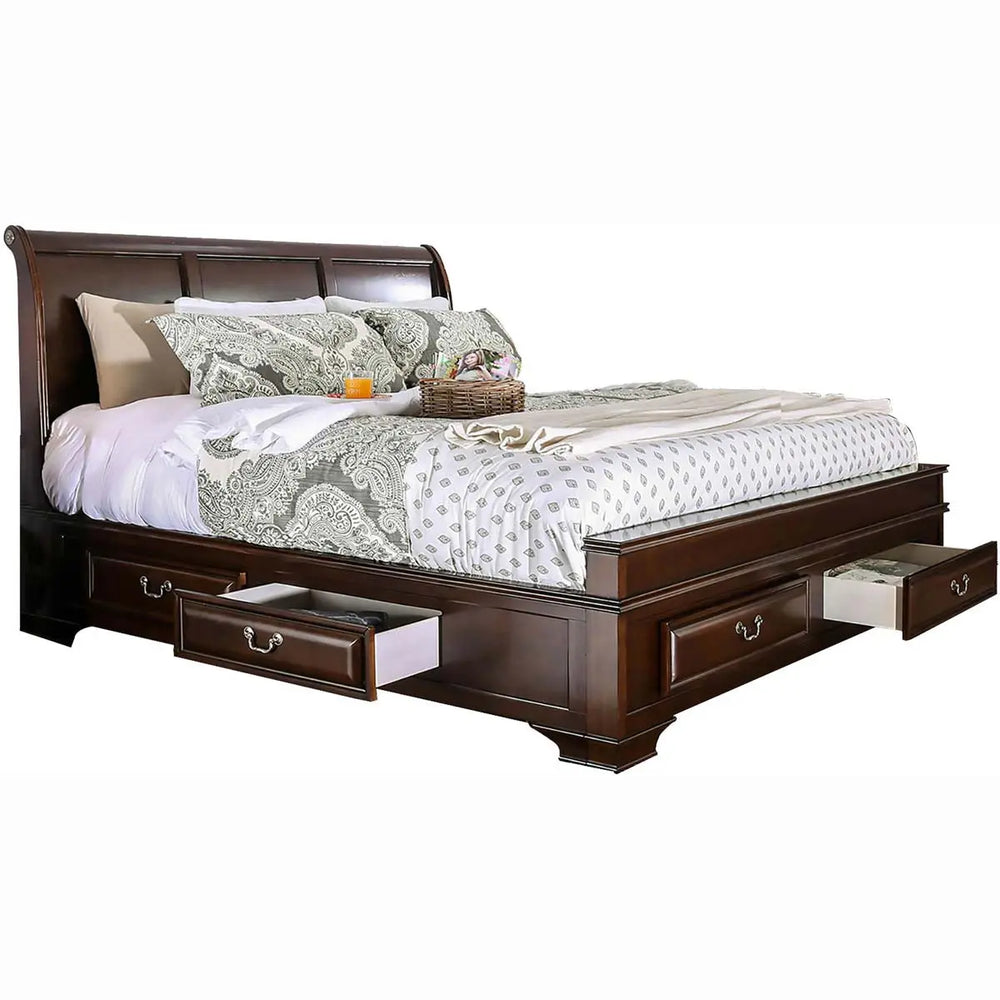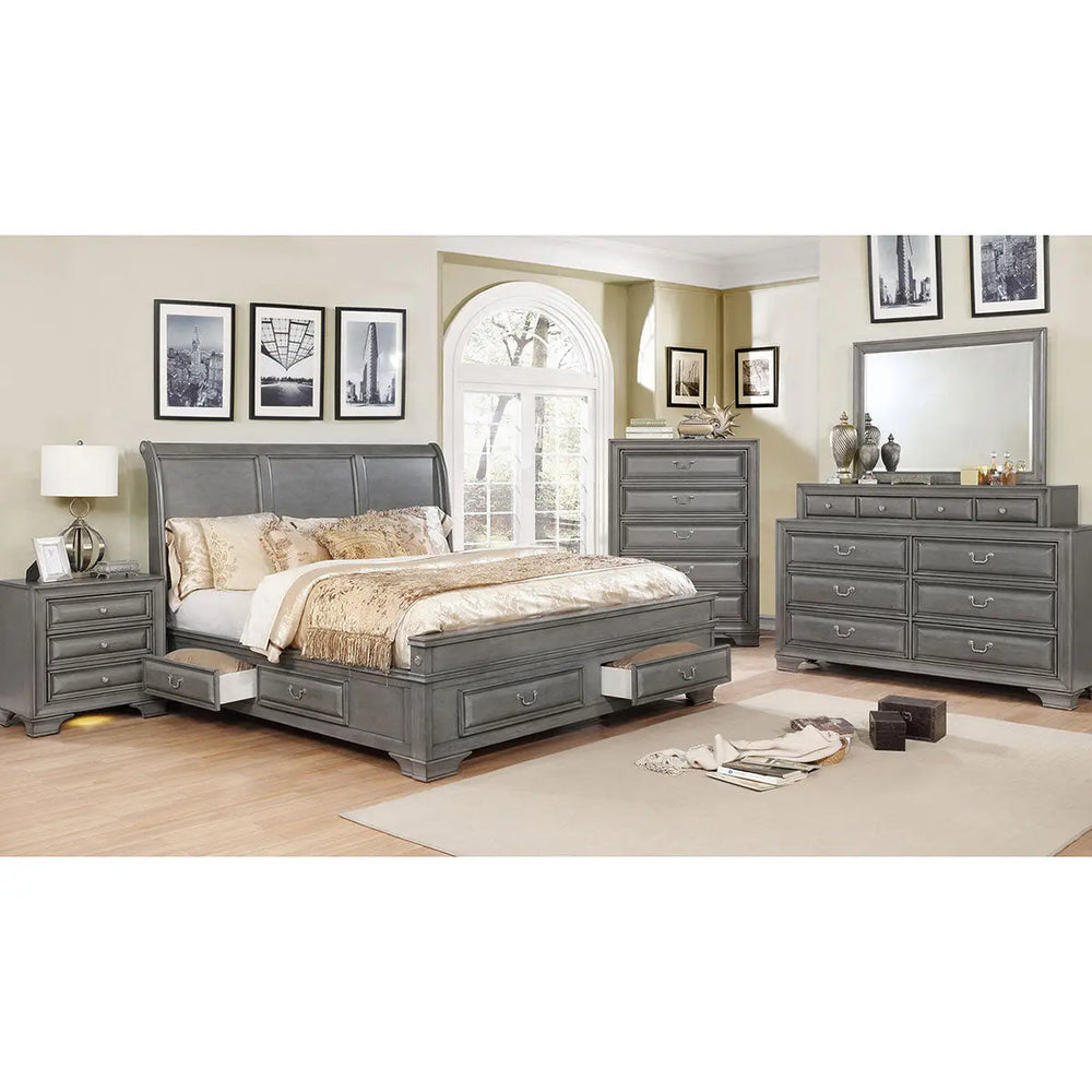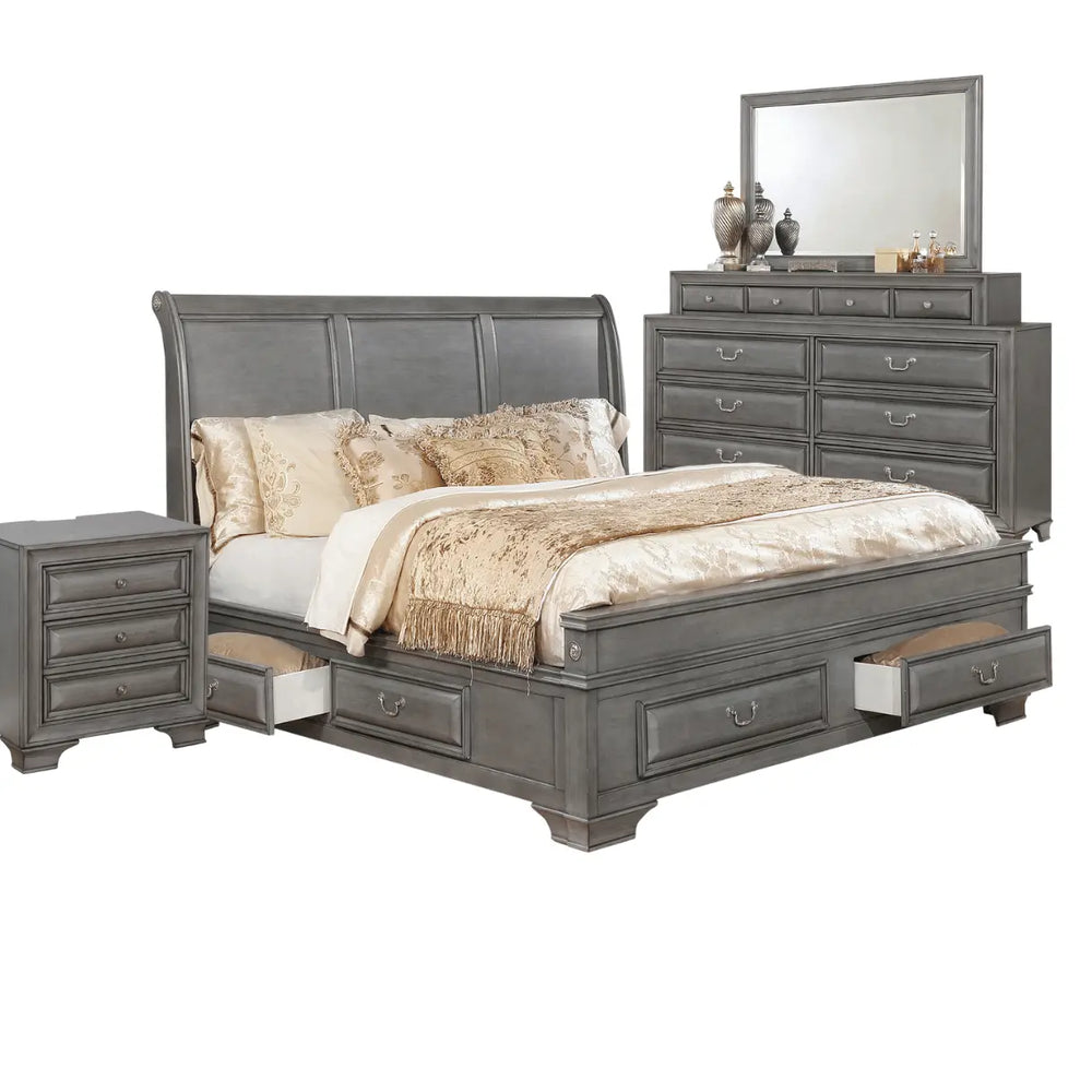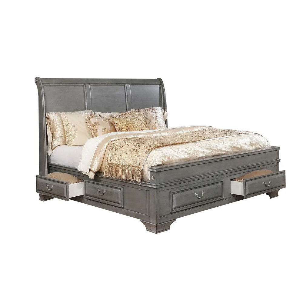 The Milton Collection exudes classic charm, particularly with transitional styling and a grey wood finish; it also offers a variety of functionality. The bed's sleigh headboard with panel detailing catches the eye right away, while a low-profile footboard with two drawers (and four more fitted into the side railings) provides plenty of storage. Picture frame detailing, French-front and English-back dovetail constructed easy-glide drawers, and antique-style silver toned drop handles make the Milton one of the most intelligently crafted beds on the market. Also available in a warm cherry brown finish.