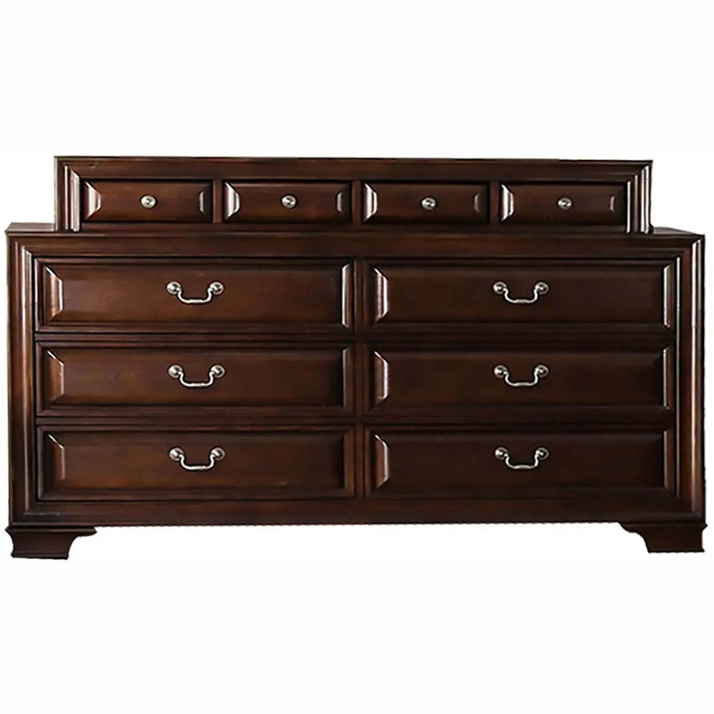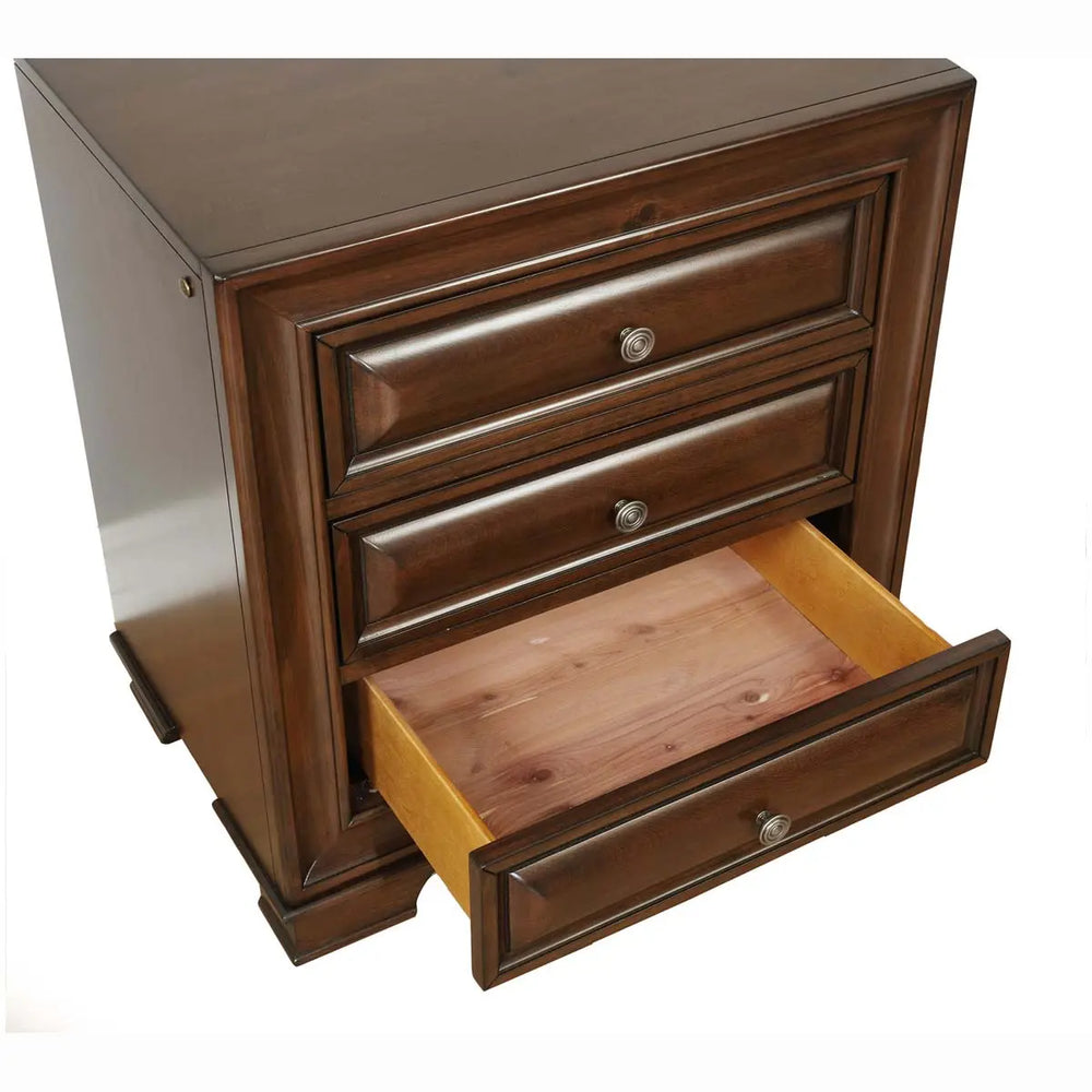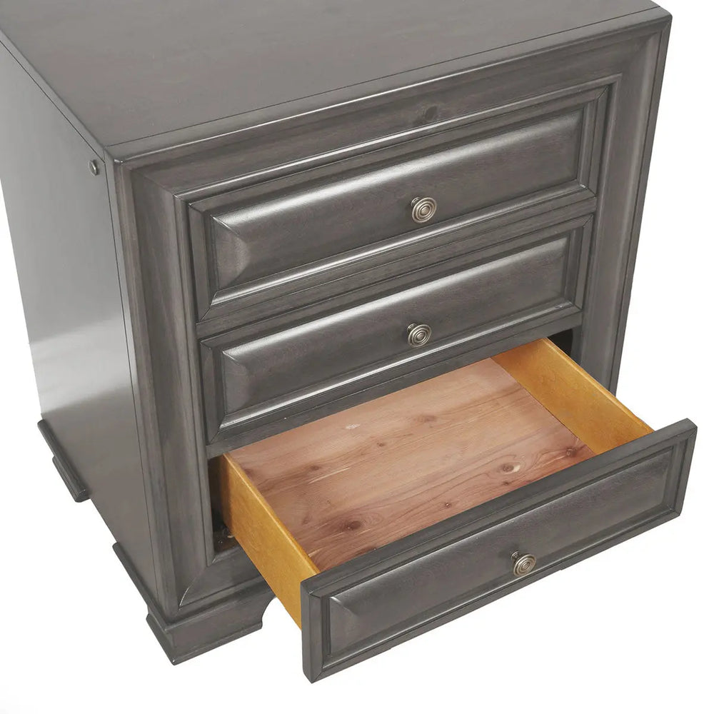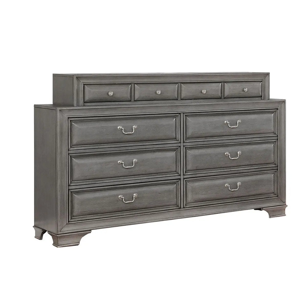 The Milton Collection exudes classic charm, particularly with transitional styling and a grey wood finish; it also offers a variety of functionality. The bed's sleigh headboard with panel detailing catches the eye right away, while a low-profile footboard with two drawers (and four more fitted into the side railings) provides plenty of storage. Picture frame detailing, French-front and English-back dovetail constructed easy-glide drawers, and antique-style silver toned drop handles make the Milton one of the most intelligently crafted beds on the market. Also available in a warm cherry brown finish.