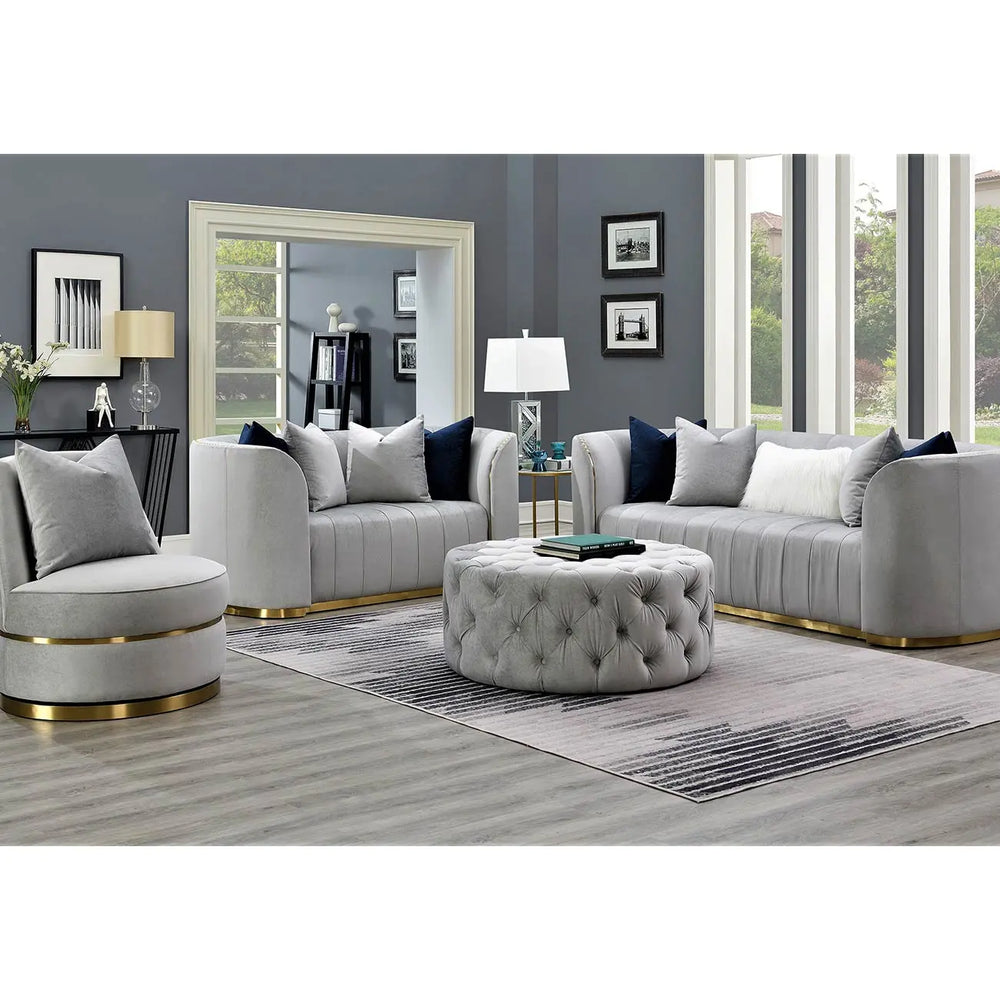 A Carla Sofa Set in Grey includes sofas, loveseat & chair with a design in which the fabric is attached with buttons or stitching to create a tufted or textured pattern on the surface. Elevate your house with this tufted sofa set on sale.