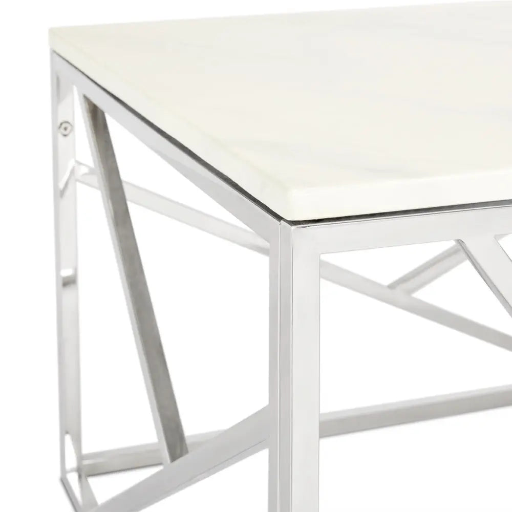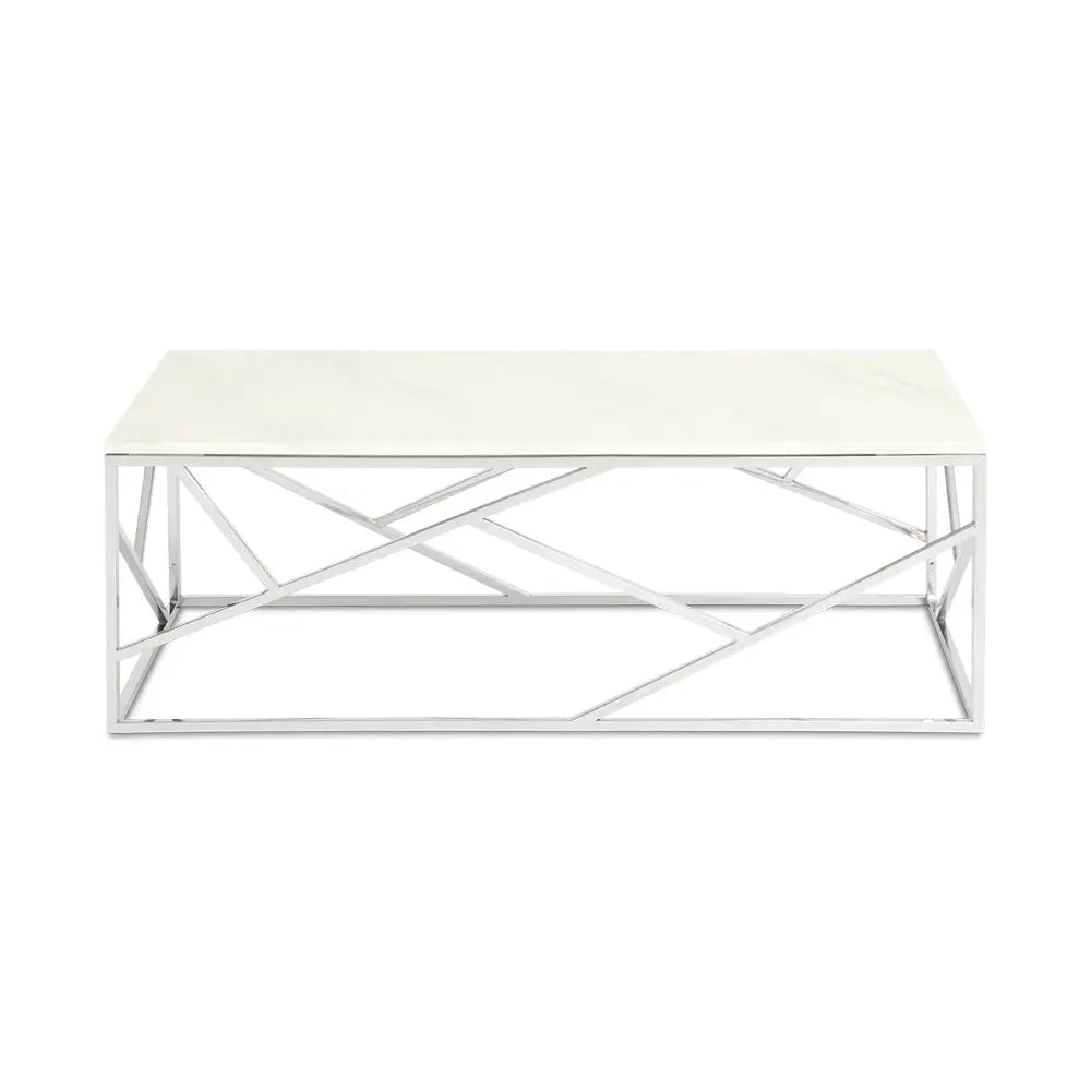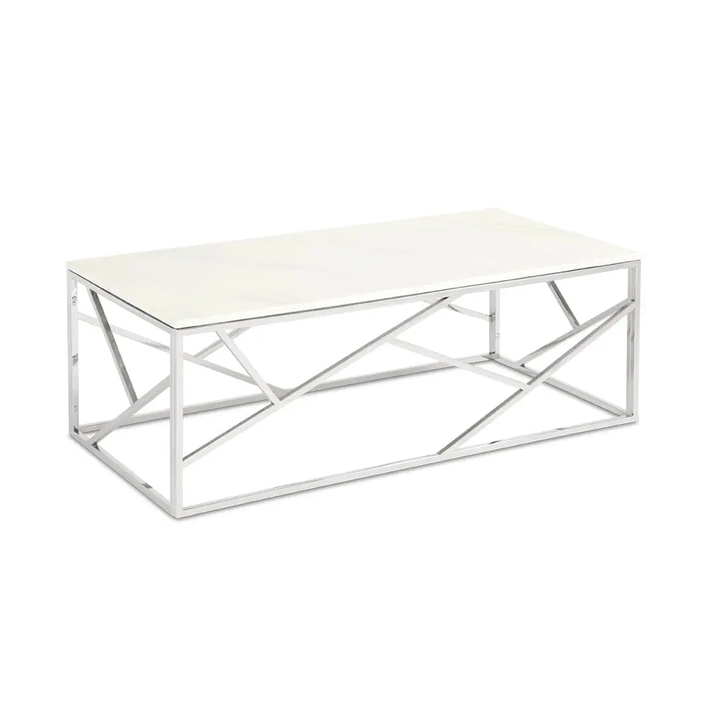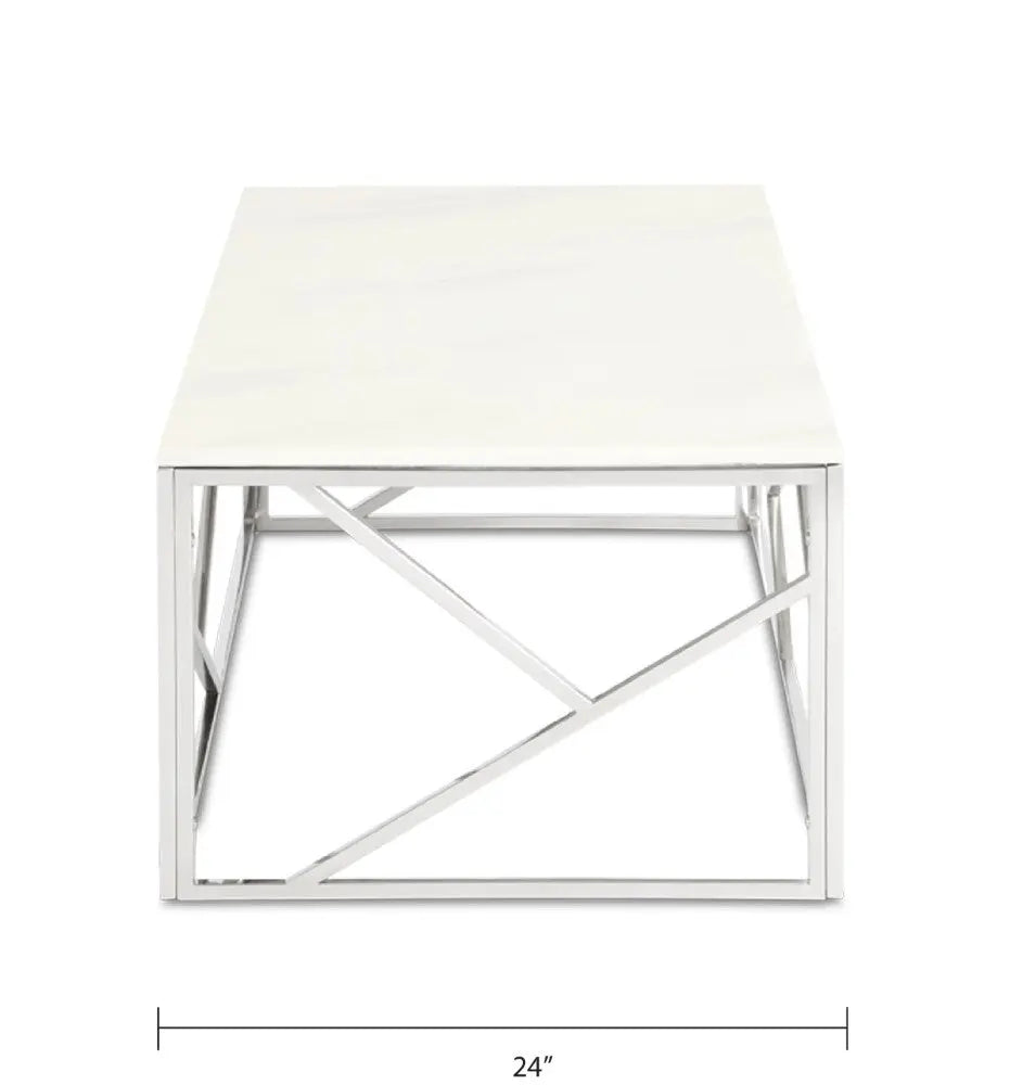 A bestseller and a fan favorite. The Carole faux marble coffee table features a stunning abstract silhouette with clean crisp lines of polished stainless steel running along in a jagged formation across the perimeter. A truly sculptural masterpiece, this coffee table will add sophistication and modern flair to your living space. With enough surface space on the faux marble top, it's the perfect centerpiece to hold books, decorative bowls, and any other existing decor. Pair it with the Carole end and console tables for a quick solution to your home decor hurdles.