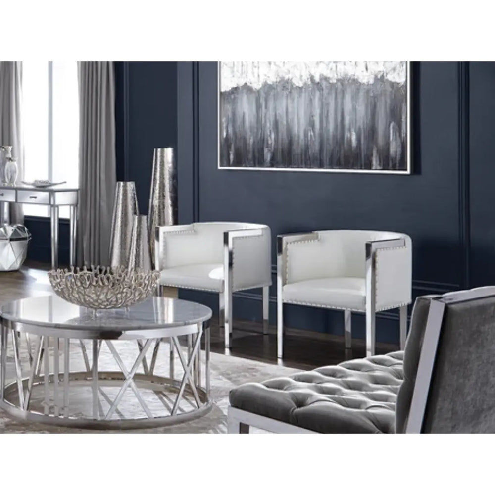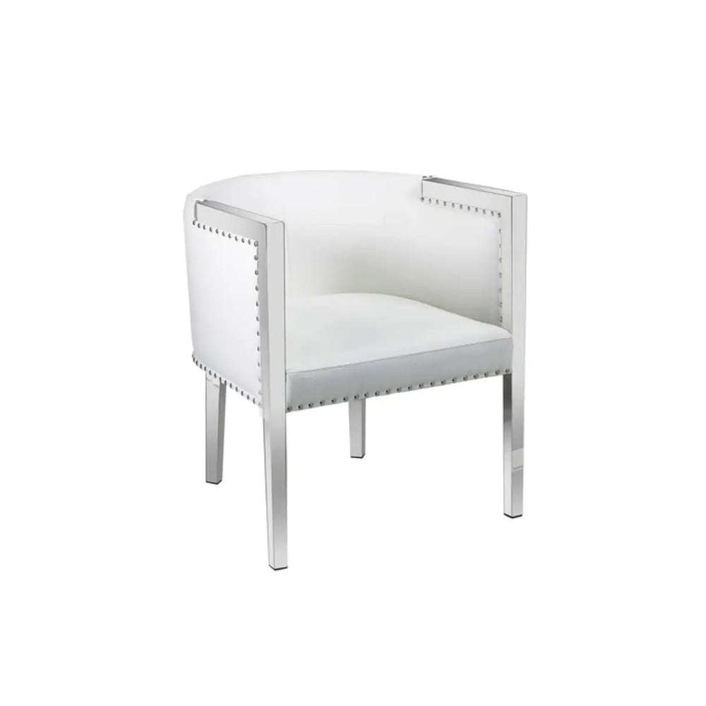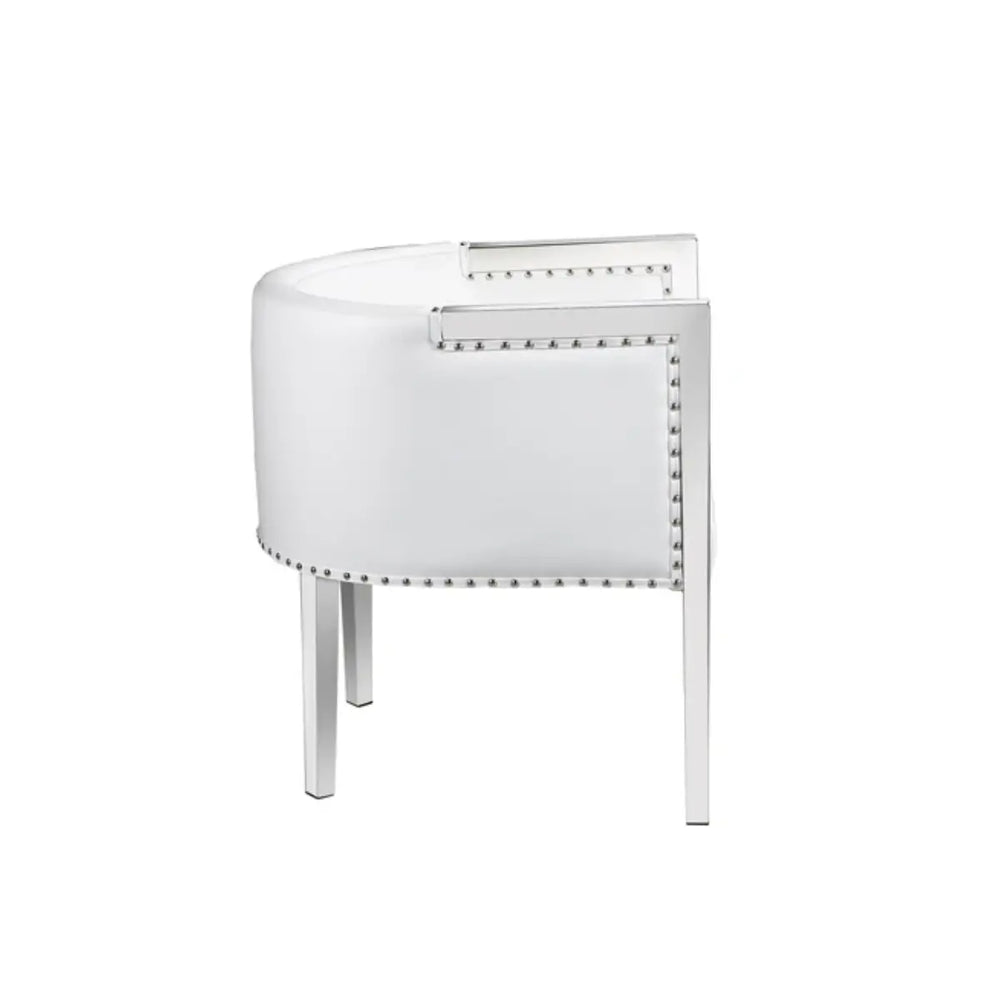 Introduce a touch of contemporary elegance to your living or office space with this stunning Elvis Accent Chair. This chair is designed to provide both style and comfort, making it an ideal choice for any modern setting. The rich white leatherette upholstery exudes luxury and sophistication, while the polished stainless steel frame adds a sleek, modern touch. The chair's unique design is accentuated with nailhead trim, giving it a refined and distinguished look. Built with a sturdy frame, this chair ensures durability and support, making it perfect for both residential and commercial use.