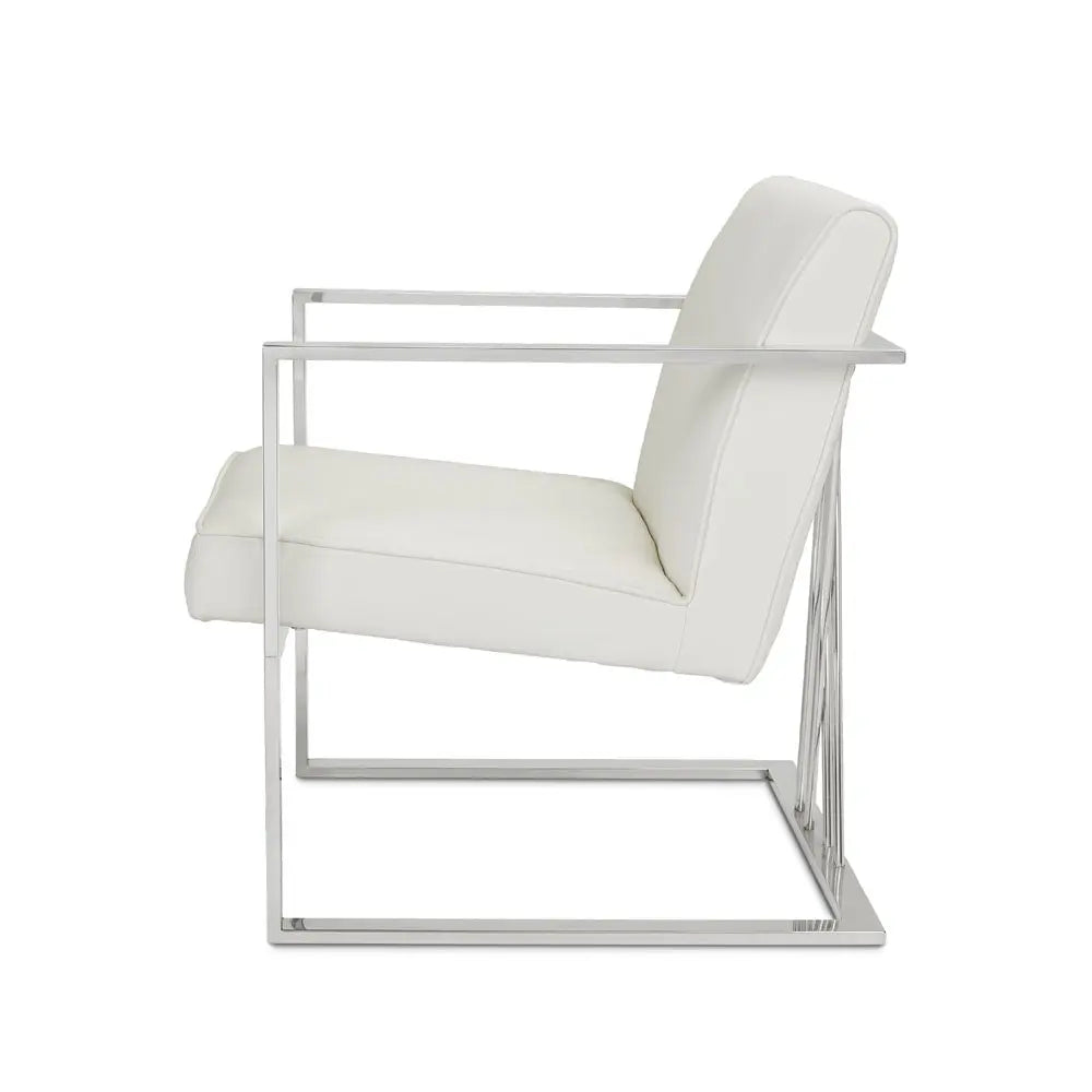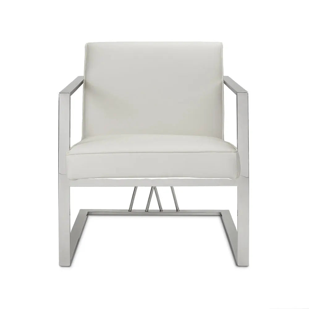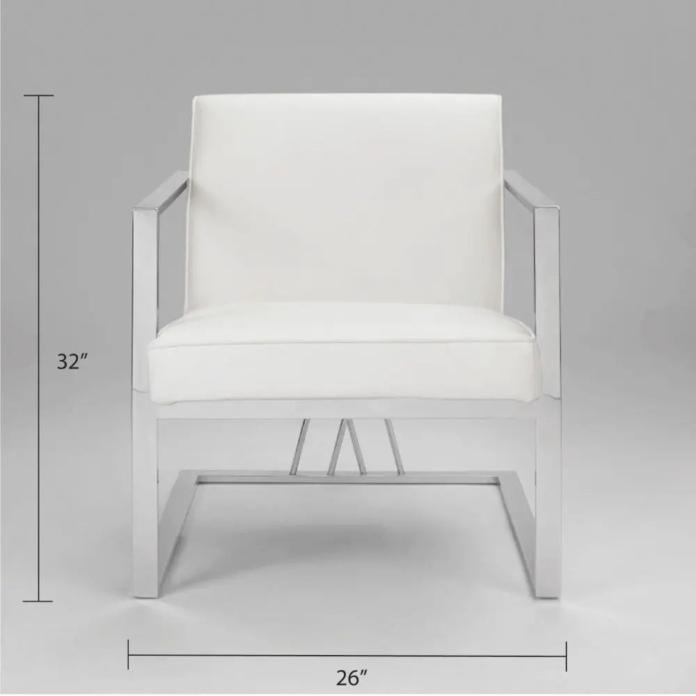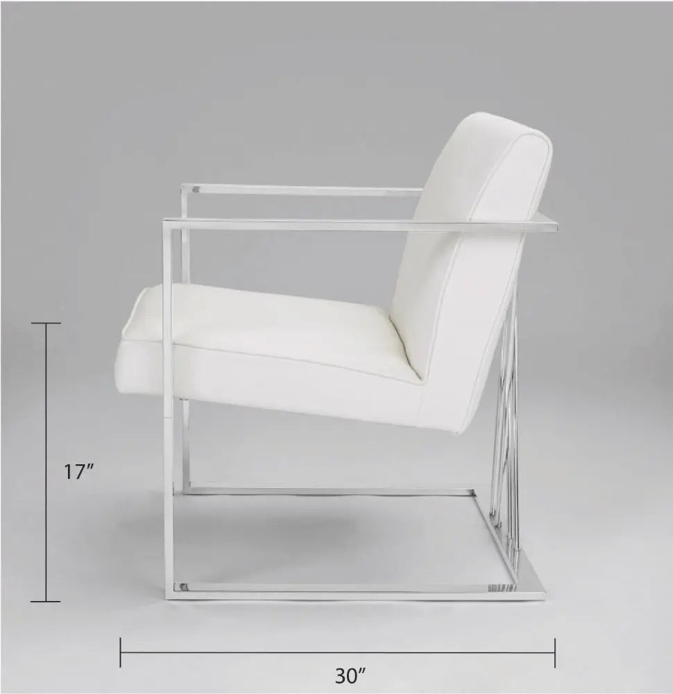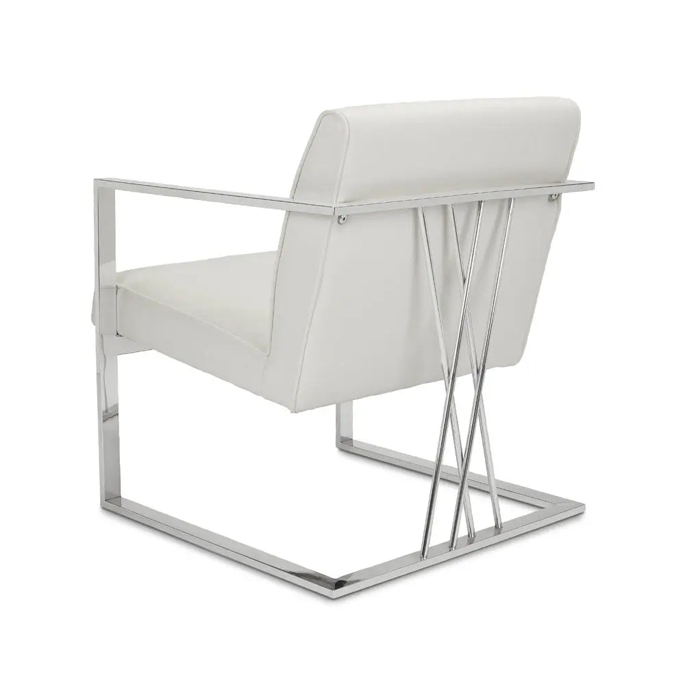 Super-sleek. The Fairmont White Leatherette accent chair boasts a modern contemporary frame with a unique doubled crossed base design. The design gives the illusion of a floating seat, as supported by the polished stainless steel frame. Add a touch of sophistication to your home decor and accentuate all styles of your existing interior design.