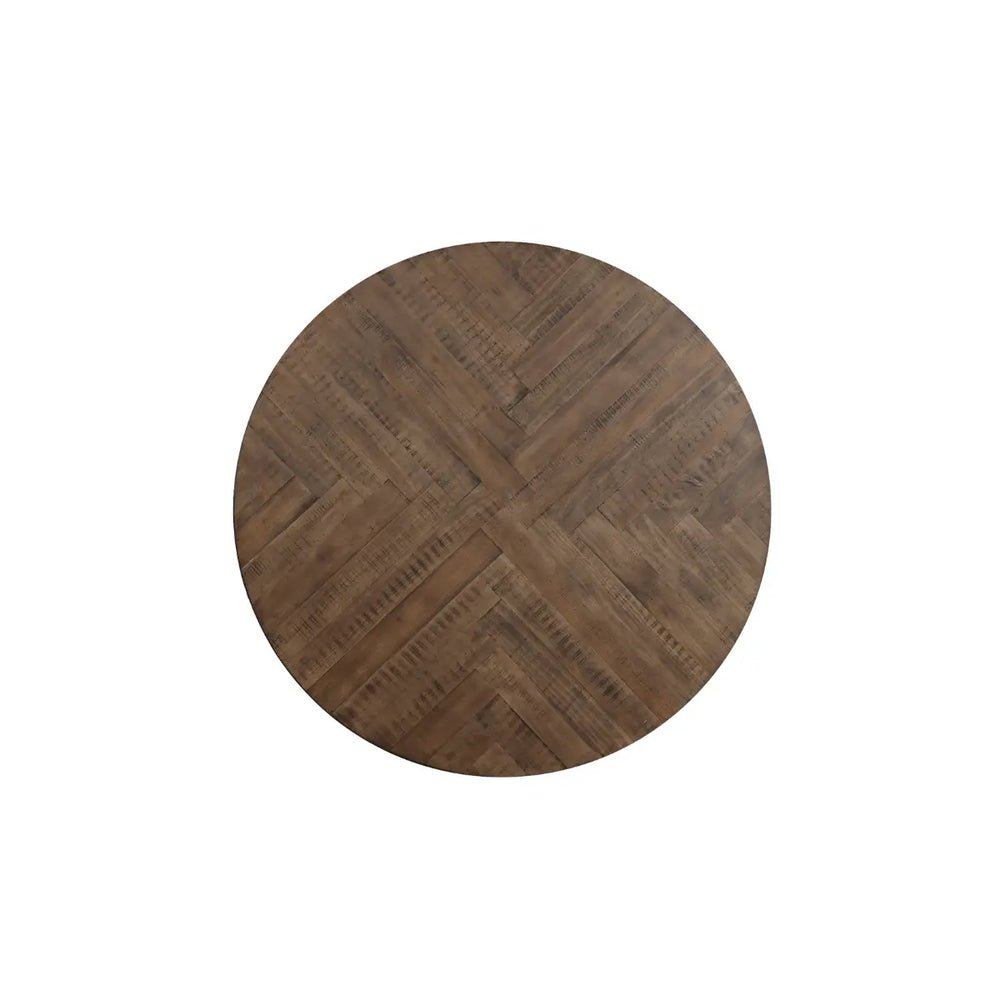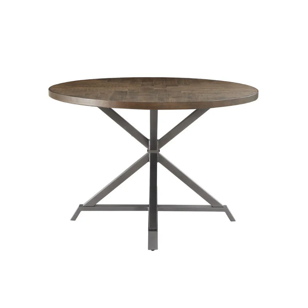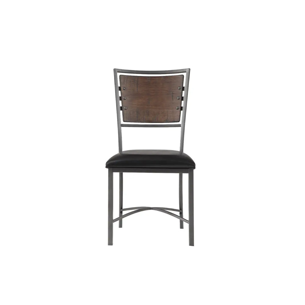Wood and metal are combined to create the rustic industrial style of the Fideo Collection. Metal framing supports the table and creates the profile of the wood-backed side chairs in this casual dining set. Pine solids and veneer are featured in a herringbone pattern and has been given a burnished finish to complement the gray metal frame.
