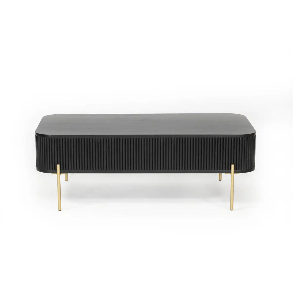 Complementing the black wood, the coffee table boasts gold finished iron legs that add a touch of glamour and visual interest. The contrast between the black and gold creates a striking combination, elevating the table's contemporary aesthetics. The iron legs not only provide sturdy support but also contribute to the table's overall elegance and charm. Whether you're enjoying a morning cup of coffee or entertaining guests, the Fontana Coffee Table provides a spacious and stylish surface for your needs. Its contemporary styling seamlessly blends with a variety of decor styles, making it a versatile addition to any living room.
