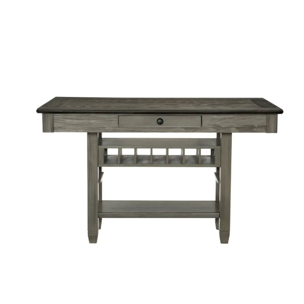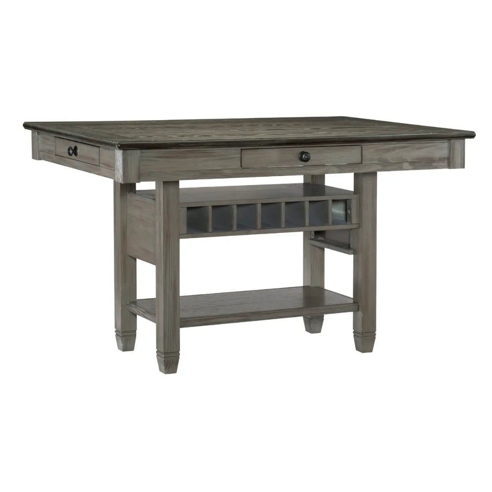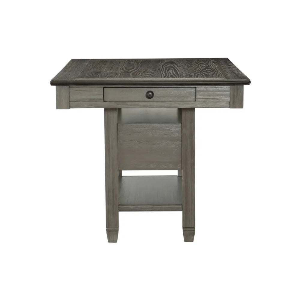Inspired by the aesthetic of a casual country kitchen, the Granby Collection is an inviting gathering spot for mealtime with family and friends. A two-tone finish of the counter height table presents as a harmonious combination of color. The gray fabric seat complements antique gray finished counter height chair frame. 4-drawer on table apron and a 3-door server provide ample space in which to store your tabletop accessories.