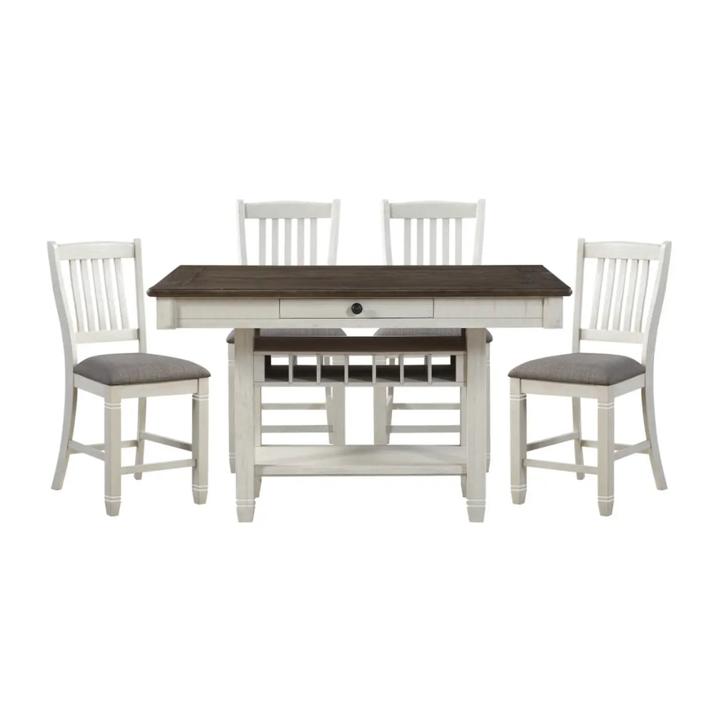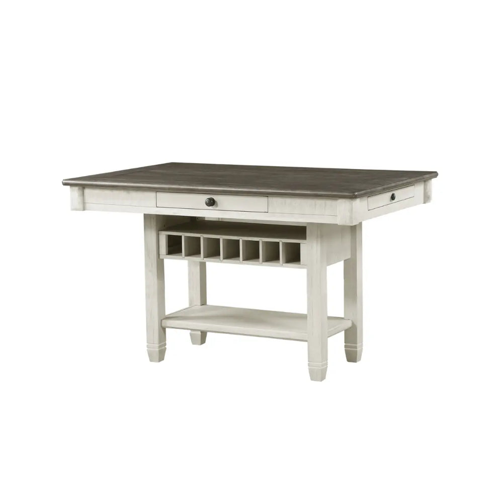 Inspired by the aesthetic of a casual country kitchen, the Granby Collection is an inviting gathering spot for mealtime with family and friends. 36-inch counter height with 4 drawers on the apron and storage display shelf base. The two-tone look of the acacia and pine solids base, finished in antique white, and the elm veneer of the table’s top, finished in a rosy brown, present as a harmonious combination of color. Also available for the 72-inch table – side chair, bench and server.