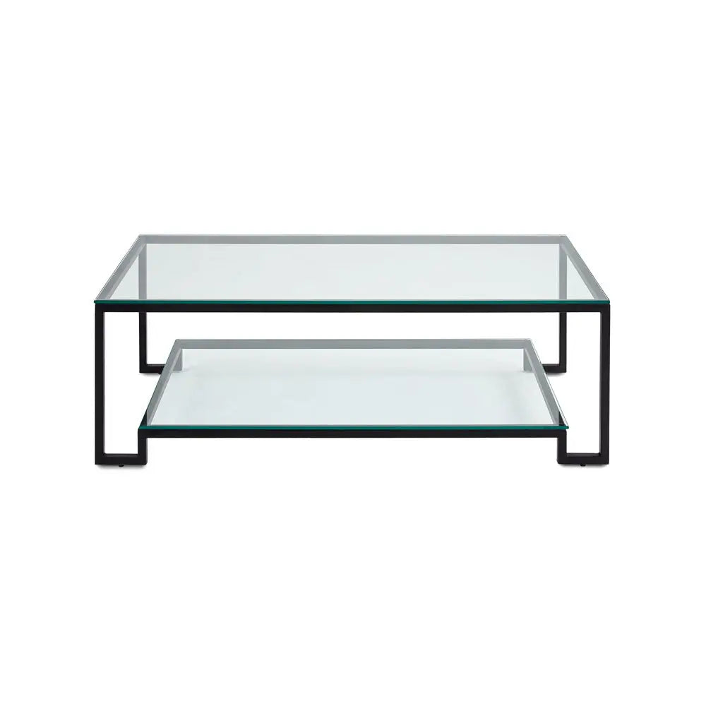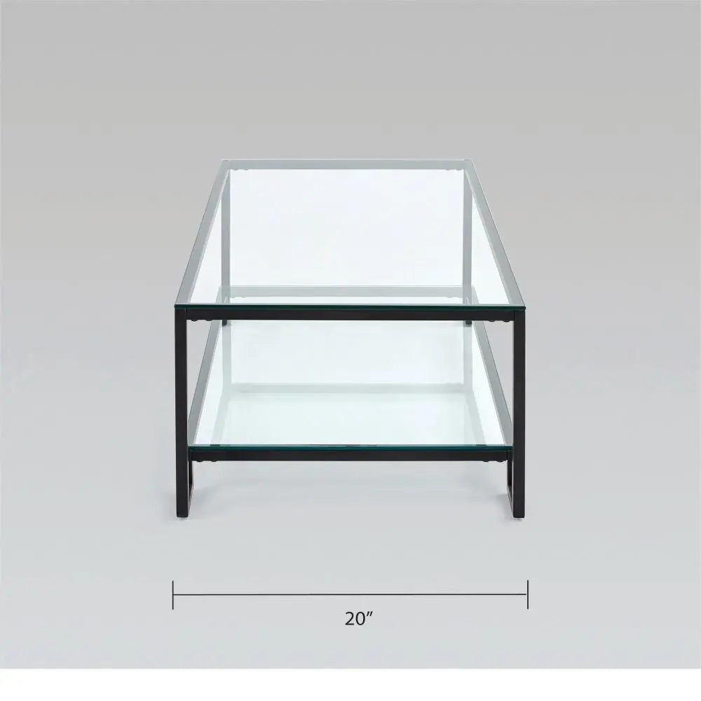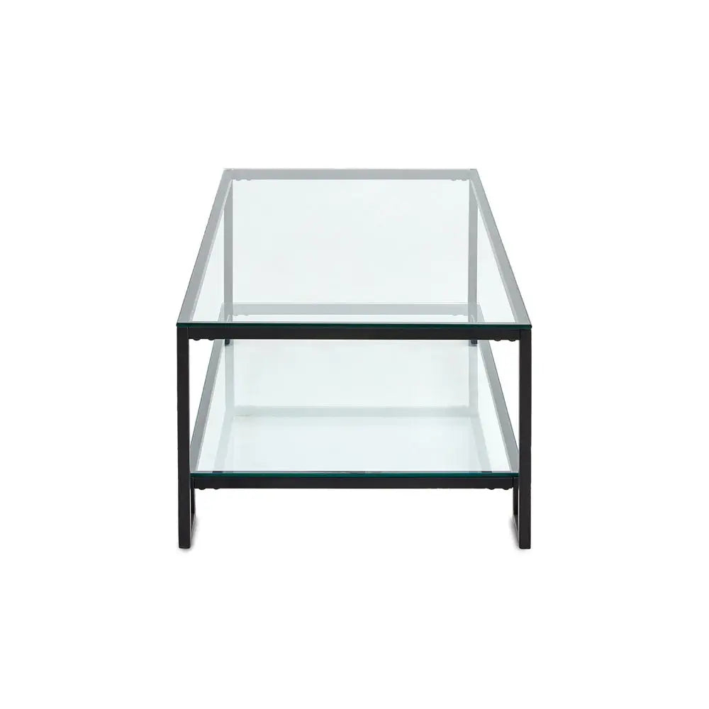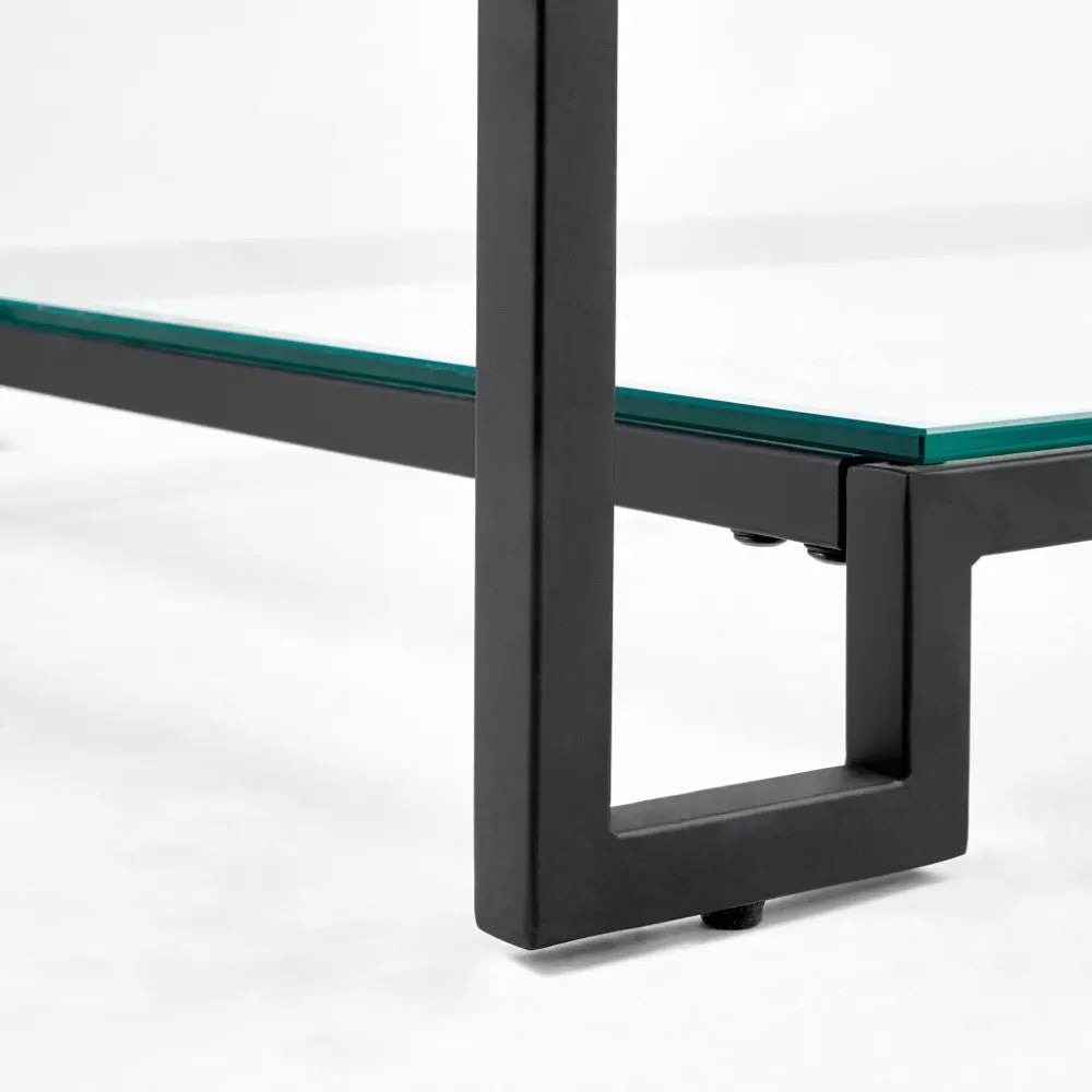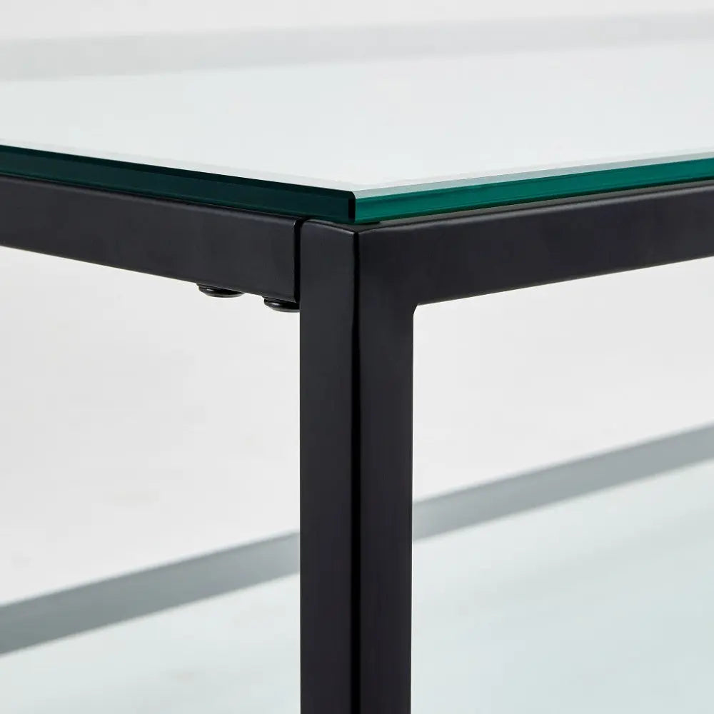 Chic, cool, and understated. Clean lines and sleek black metal make up the Krista console table. The open frame is finished with a rectangular tempered glass top and shelf. This subtle piece with its clear glass and industrial black metal will not only open up your space with its clean design but will also let you display your decor in layers with the built-in shelf. Create a unified look by pairing it with pieces from the Krista series which include a coffee and end table.