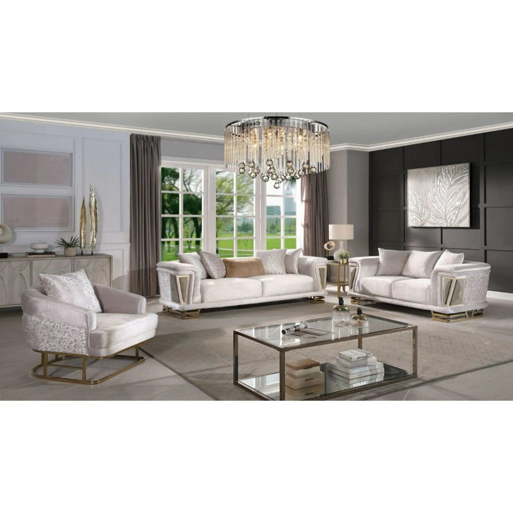 Elevate your living space with this luxurious modern living room set, designed to blend elegance and comfort effortlessly. Upholstered in a soft, shimmering fabric with subtle textured accents, each piece showcases refined details such as gold-tone geometric trim, plush cushioning, and coordinating accent pillows for a sophisticated touch. The set includes a spacious sofa, loveseat, and swivel chair, all crafted with deep seating and supportive armrests for maximum comfort. Perfectly complemented by a sleek glass-top coffee table and chic metallic finishes, this collection transforms your home into a statement of style and luxury.