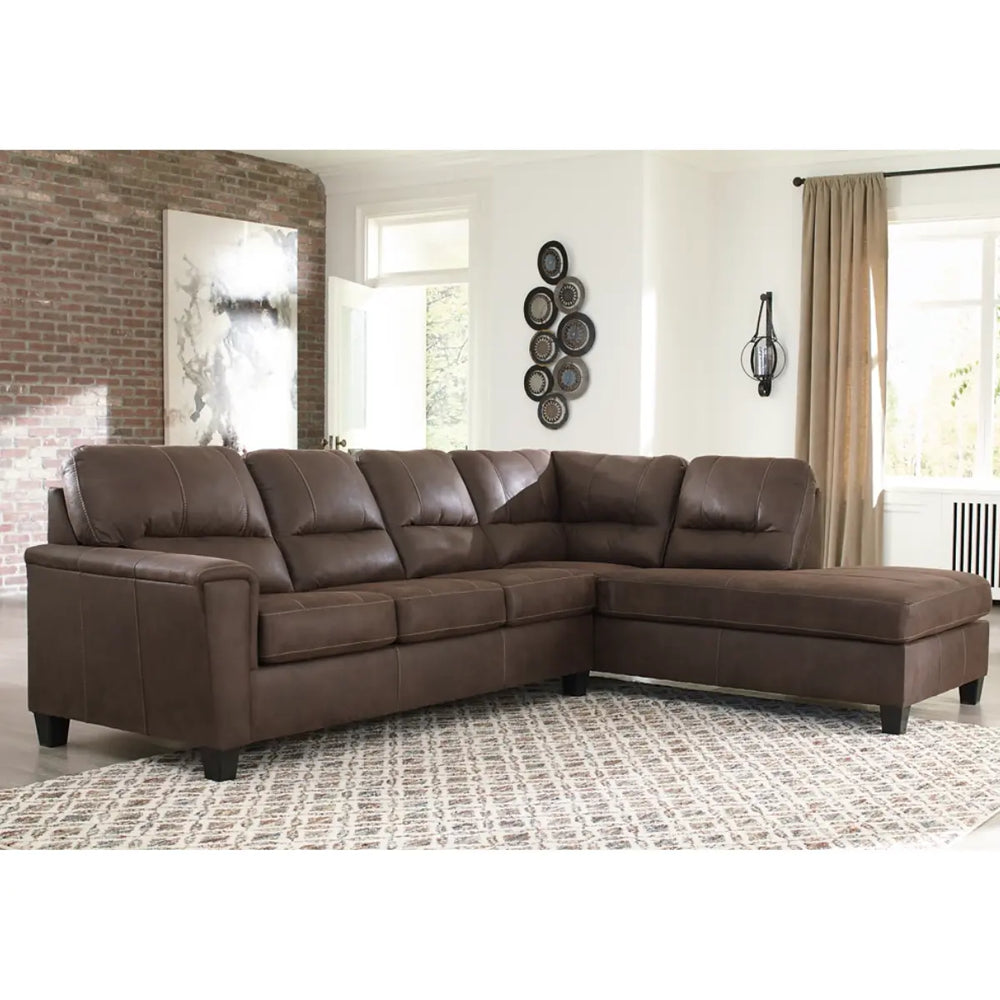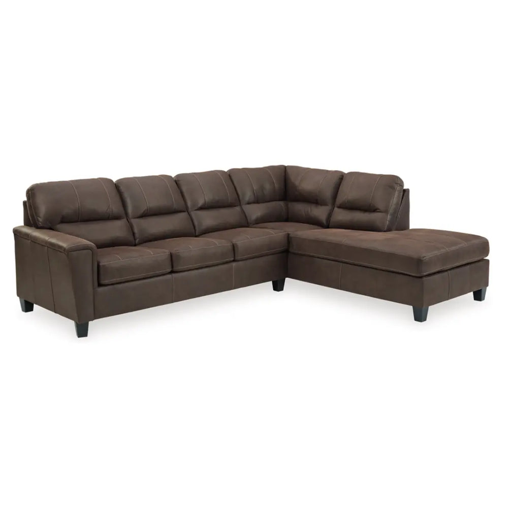 If you love the cool look of leather but long for the warm feel of fabric, you can take comfort in the Navi sectional. Wrapped in a fabulous faux leather with a weathered hue and hint of pebbly texture to resemble the real deal, this decidedly modern sectional proves less is more. Elements include angled side profiling and track armrests wrapped with a layer of pillowy softness for that little something extra. Prominent jumbo stitching and clean-lined divided back styling lend fashion-forward flair.
