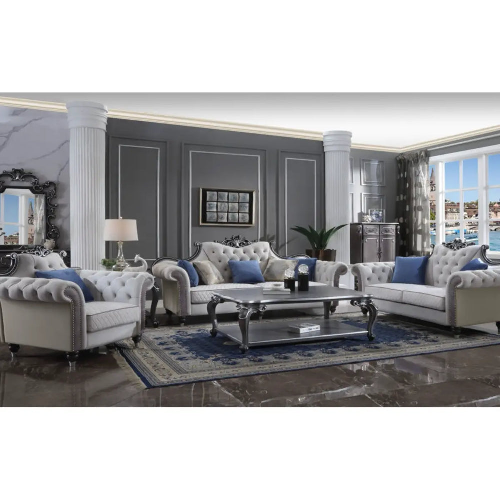 This elegant sofa set includes a sofa, loveseat, and chair, all crafted with a timeless tufted design and luxurious silver-tone accents. Featuring plush cushions and sturdy construction, this set blends comfort with sophistication, making it a perfect centerpiece for any living room.