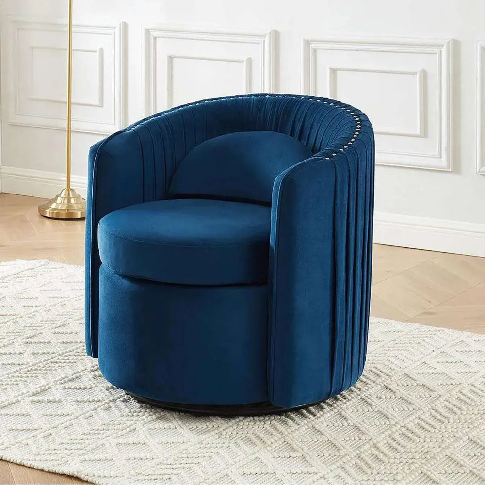 Perfect for an understated modern accent, this sleek armchair features solid construction, velvet upholstery and a swivel base for extra comfort. Upholstered in a blue velvet fabric, this swivel chair features flared arms and a low back which create a stunning look. The high-density foam seat cushion provides added comfort, while the swivel base in metal allows the chair to completely rotate 360 degrees. The barrel-back design of this accent chair provides a cozy seat for watching TV, reading and a lot more.