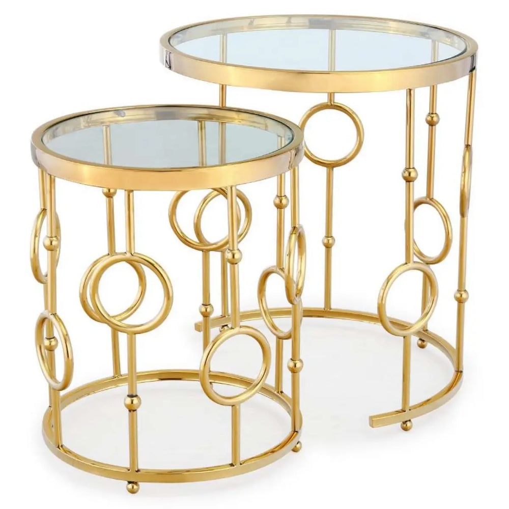 Add a touch of sophistication to your living space with this set of two elegant gold metal side tables. Featuring round glass tops and a unique frame adorned with circular and spherical accents, these tables blend modern design with timeless elegance. Perfect for any contemporary home, they provide both style and functionality.