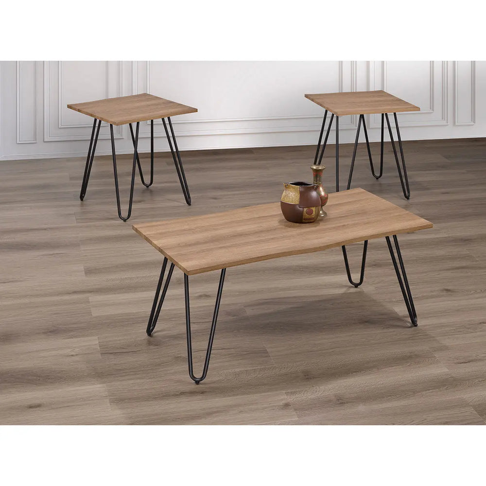 Introducing the Titus 3pc Wood Coffee Table Set, including one coffee table and two end tables, designed to bring a modern and unique touch to your living space. Crafted with contemporary flair, this set features distressed oak veneer table tops that exude rustic charm and character, beautifully complemented by the sleek black metal legs. Built to last, these tables offer sturdiness and strength for everyday use, while the "V" shaped metal legs provide excellent support and stability. The live edge table top adds a touch of natural beauty, making this set a captivating focal point in any room. Elevate your decor with this stylish and functional coffee table set that combines modern design with timeless appeal.