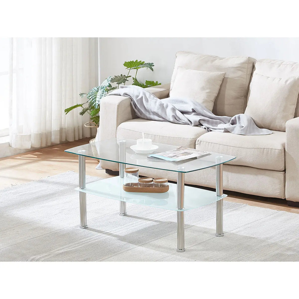 Introducing the Titus Glass Coffee Table in Chrome, a sleek and versatile addition to your living space. The fusion of glass tops with frosted glass shelves not only enhances the table's aesthetic appeal but also offers practical storage and display options. Supported by steel finished pillar legs, this coffee table strikes the perfect balance between style and durability, ensuring long-lasting beauty and stability. Crafted with precision and premium materials, it exudes quality craftsmanship that stands the test of time. Its transparent design effortlessly complements any color scheme and decor, making it a versatile centerpiece for your room. Upgrade your living space with the timeless elegance and functionality of the Titus Glass Coffee Table in Chrome.