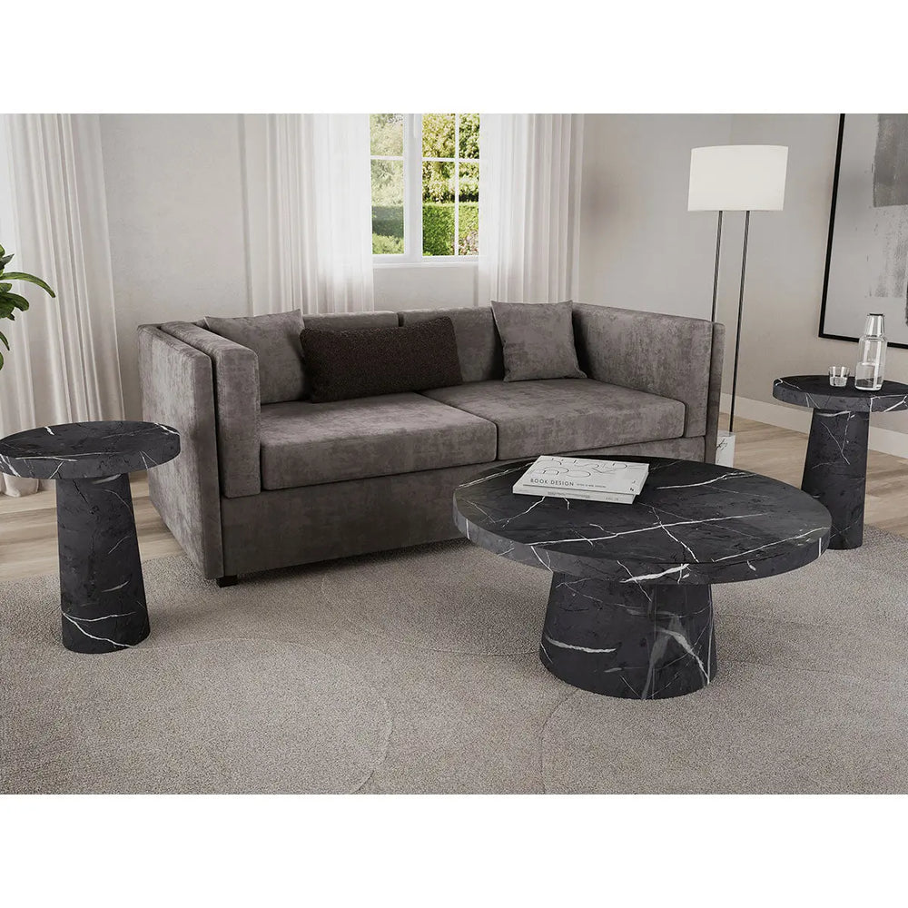 Introducing the Titus Marble 2pc Coffee Table Set, a luxurious addition to your living space. Available in various color variations, this set features a high gloss marble finish that exudes sophistication and elegance. The round coffee table boasts a large tabletop supported by a sturdy pillar base, offering both visual appeal and quality design. Elevate your decor with this contemporary masterpiece, making a statement in style while embracing the allure of marble. Redefine your living space and elevate it to new heights with this modern and sophisticated coffee table set.