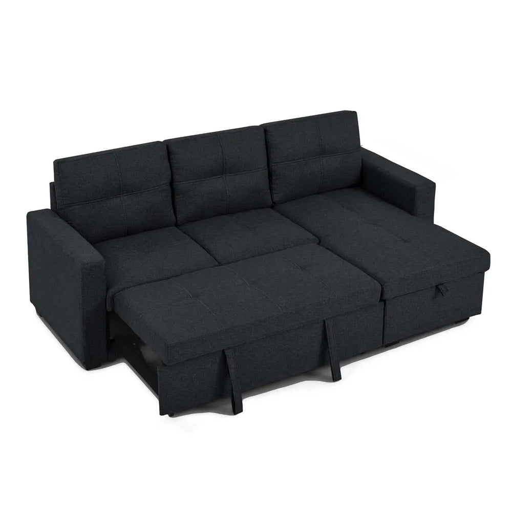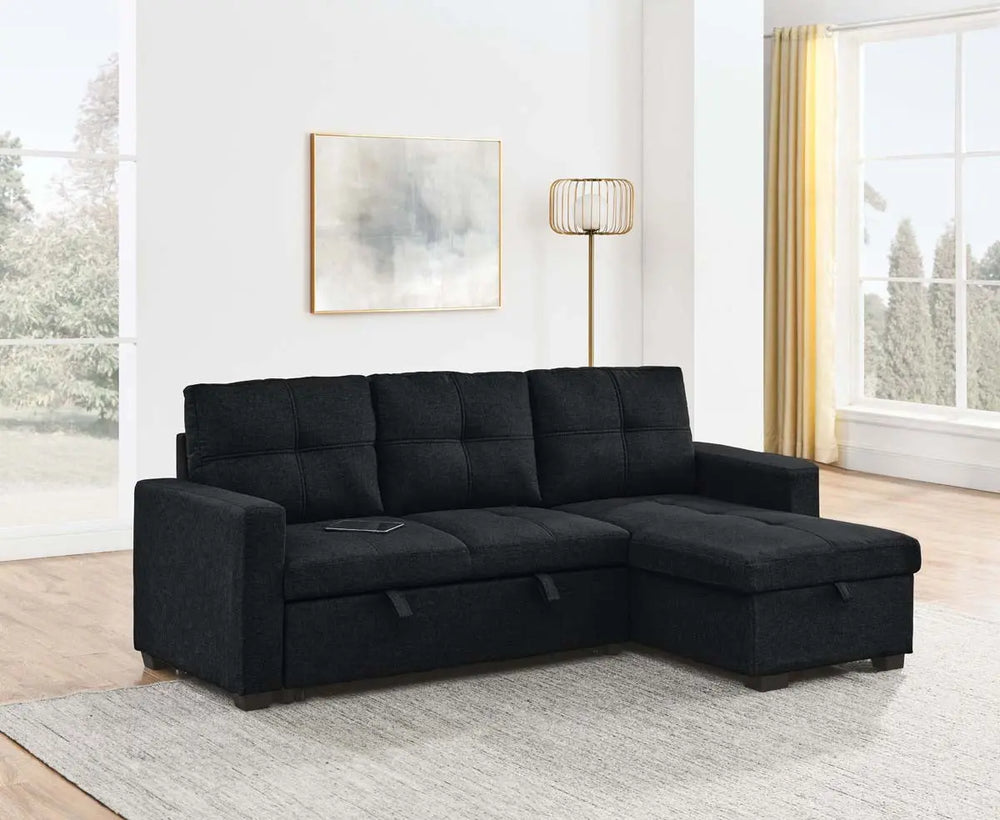 Introducing the Titus Modern Pull-Out Fabric Sectional Sofa Bed in Black, where convenience meets style for effortless living. Transitioning from sofa to bed is a breeze with our easy pull-out function, ensuring more time spent enjoying moments with loved ones and less time on setup. Optimize your space with the integrated storage in our spacious ottoman, keeping your living area tidy without sacrificing style. Tailored for comfort, our sofa sectional offers a soft touch and inviting feel that enhances any decor, providing the ultimate lounging experience. With its adaptable design and reversible feature, customize the layout to suit your space effortlessly. Transform your living room into a welcoming retreat for overnight guests with its full-size bed functionality, ensuring they wake up feeling refreshed and ready to take on the day.