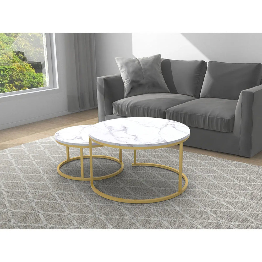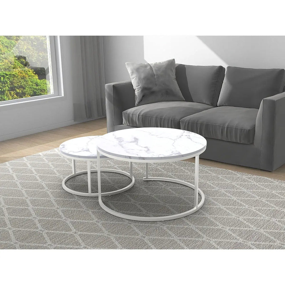 Experience the perfect combination of style and versatility with the Titus Muse 2pc Wood Coffee Table Set. Crafted with precision and durability in mind, this coffee table set features elegant marble veneer tabletops that add a touch of luxury to your living room. The removable second table underneath offers added functionality, allowing you to adapt to various needs effortlessly. Designed with a space-saving mindset, the smaller table slides snugly under the larger one when not in use, making it perfect for smaller living areas or when extra room is needed. With sturdy silver legs providing stability, this coffee table set is not just a stylish accent but also a reliable addition to your home decor.