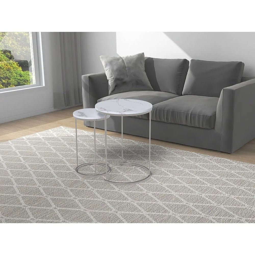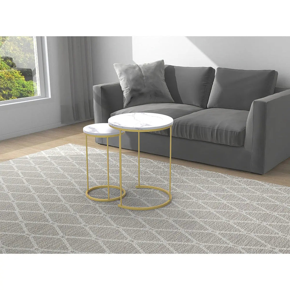Introducing the Titus Muse 2pc Wood End Table Set, where style meets functionality in perfect harmony. Crafted with precision, these end tables feature an elegant marble veneer tabletop that adds a touch of luxury to your living space. The removable second table underneath offers versatility, allowing you to adapt to various needs effortlessly. Designed with a space-saving mindset, the smaller table slides snugly under the larger one when not in use, making it ideal for smaller living areas or when extra room is needed. With sturdy silver legs providing stability, this end table set is not just a beautiful accent but also a reliable addition to your home decor.
