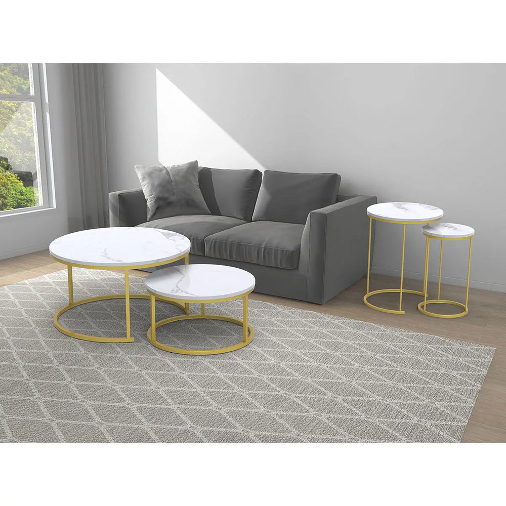 Introducing the Titus Muse 4pc Wood Coffee Table Set, a stylish and functional addition to your living space. This set features two coffee tables and two end tables, each crafted with precision and durability in mind. The elegant marble veneer tabletop adds a touch of luxury, while the removable second table underneath offers versatility for various needs. With its space-saving design, the smaller table slides snugly under the larger one when not in use, making it perfect for smaller living areas. The sturdy silver legs provide stability, ensuring reliability for years to come. Whether you’re entertaining guests or enjoying a quiet evening in, this coffee table set is a versatile accent that adapts to your needs effortlessly.