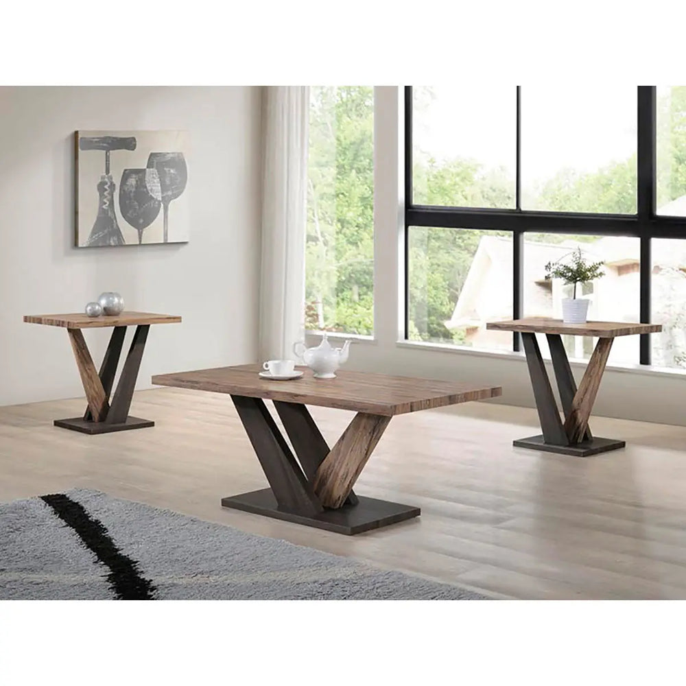 Introducing the Titus Pedestal 3pc Coffee Table Set in Caramel, a stunning addition to your home decor. With its unique pedestal design, this set is more than just furniture; it's a work of art that adds a touch of uniqueness to your living space. The distressed two-tone wood finish creates a striking visual contrast, infusing your room with character and charm. Supported by a sturdy and supportive base, this set ensures maximum stability, allowing you to enjoy your coffee, books, and decor with peace of mind. Complete with a coffee table and two end tables, this set offers a cohesive and well-designed living space, making an impactful statement wherever it's placed. Elevate your home decor with the Titus Pedestal Coffee Table Set and transform your living space into a stylish and inviting retreat.