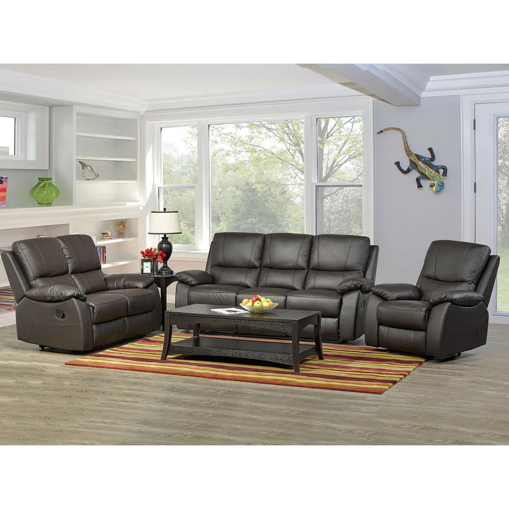 Introducing the Titus Timeless 3pc Leather Reclining Sofa Set in Espresso, the epitome of luxury, comfort, and style for your living space. Meticulously crafted with a blend of genuine leather and high-quality material, this set ensures both visual appeal and durability for years of enjoyment. Dive into ultimate relaxation with smooth reclining mechanisms on each seat, perfect for movie nights, reading sessions, or afternoon naps. Sink into sumptuous comfort with plush pillow arms, providing a cozy resting place for your arms and shoulders. Experience complete support and reduced pressure points with the full chaise pad, offering unparalleled comfort from your legs to your neck. Beyond its exceptional comfort, this sofa set makes a stunning visual impact, elevating any room with its timeless design and premium materials. It's not just furniture; it's a focal point of your decor, promising endless relaxation and style.
