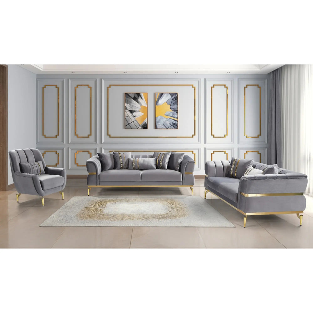 Trump Velvet Sofa Set - Grey / Sofa+Loveseat+Chair is backordered and will ship as soon as it is back in stock.